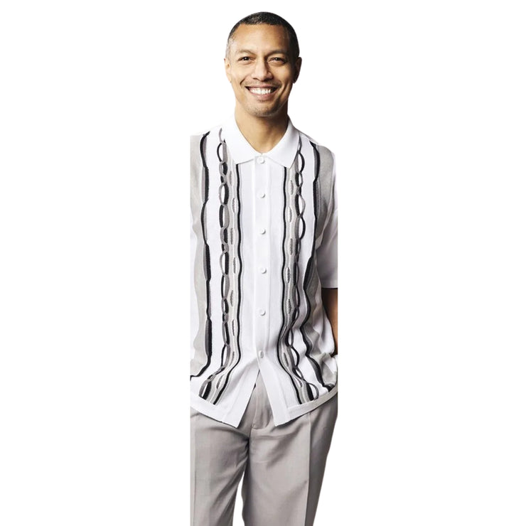 Subtle sophistication meets standout style in this grey 2-piece walking suit set. The short sleeve button-up shirt features vertical geometric stripe designs, adding dimension and texture to the front. Paired with solid grey pants, this ensemble is perfect for effortless everyday wear or relaxed evening outings. Tailored for comfort without sacrificing style, it’s a must-have for the modern man’s wardrobe.