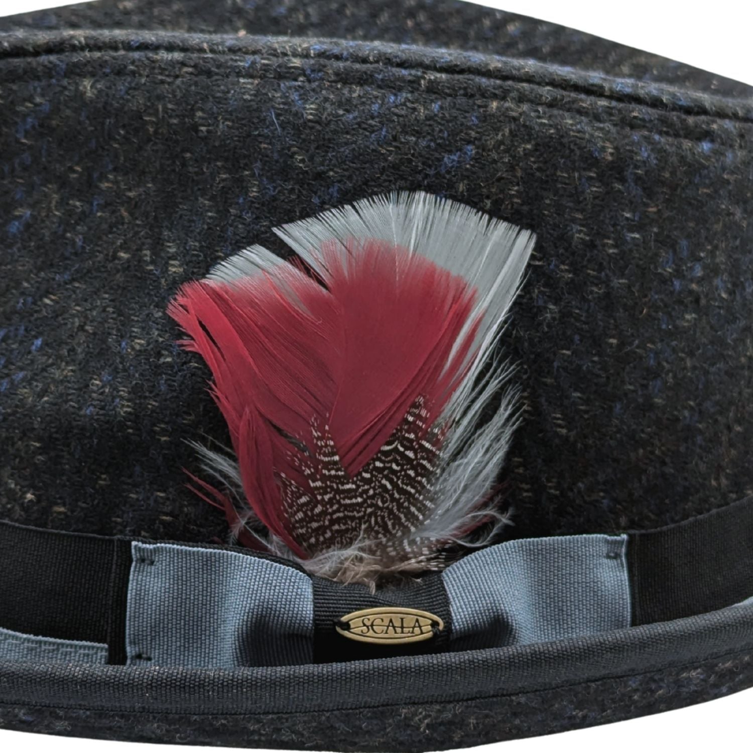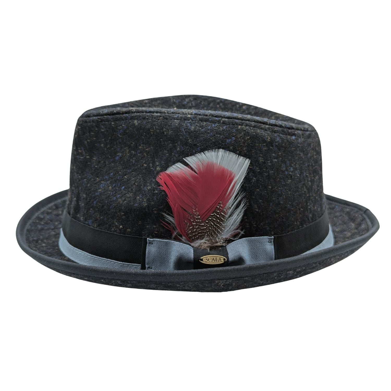 Add texture and character to your look with this Scala fedora. Made with a rich tweed wool blend, it features a unique crosspiece grosgrain band, double bow, and layered feather detail. Available in Brown and Navy, it's a versatile pick for cooler seasons.