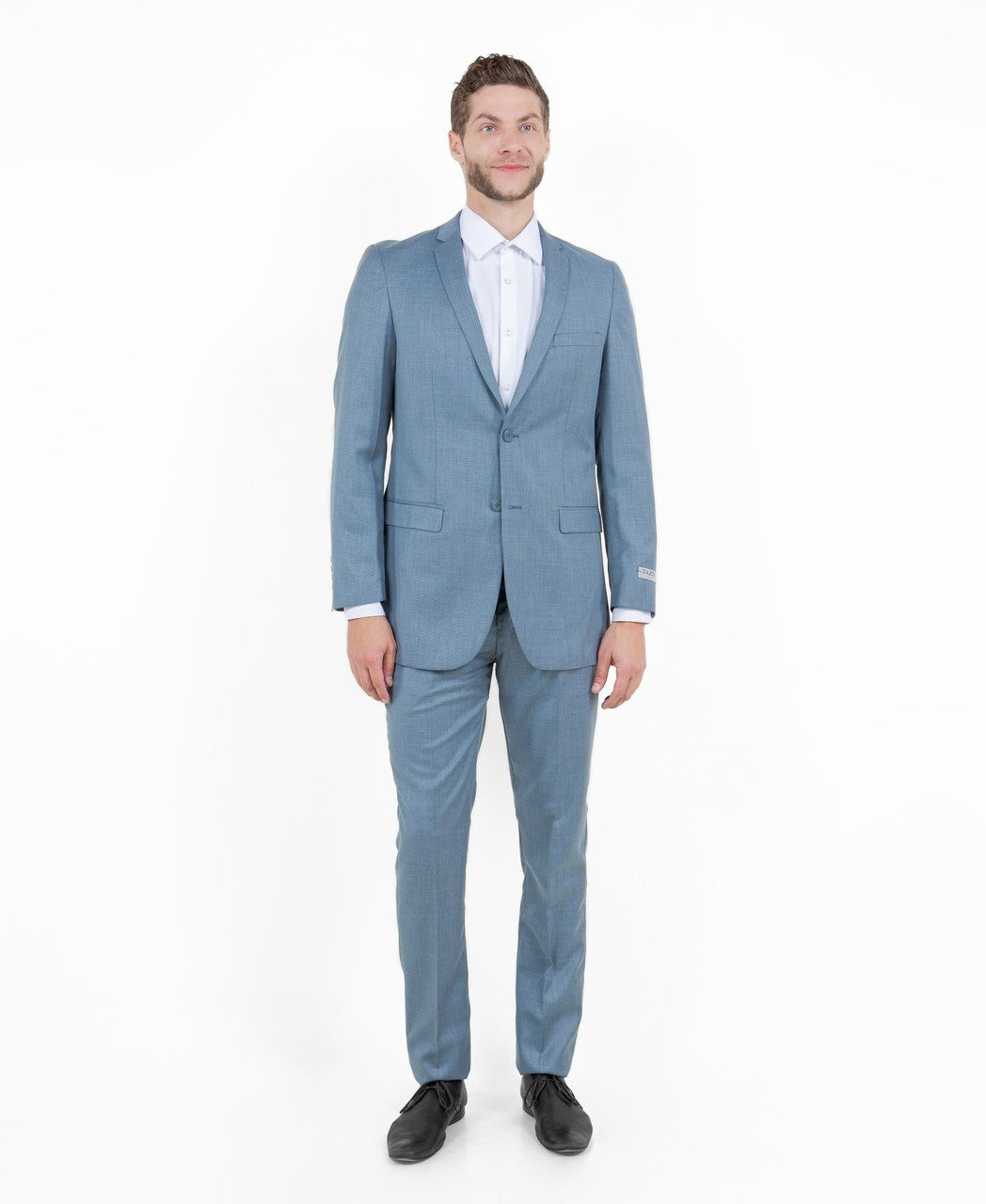 The Avalon Collection Sharkskin Two-Piece Suit in smoke blue offers a soft, versatile color that pairs well with a variety of shirts and ties. This suit's subtle blue hue and sharkskin texture provide a modern twist on traditional suiting, ideal for both office and social settings.