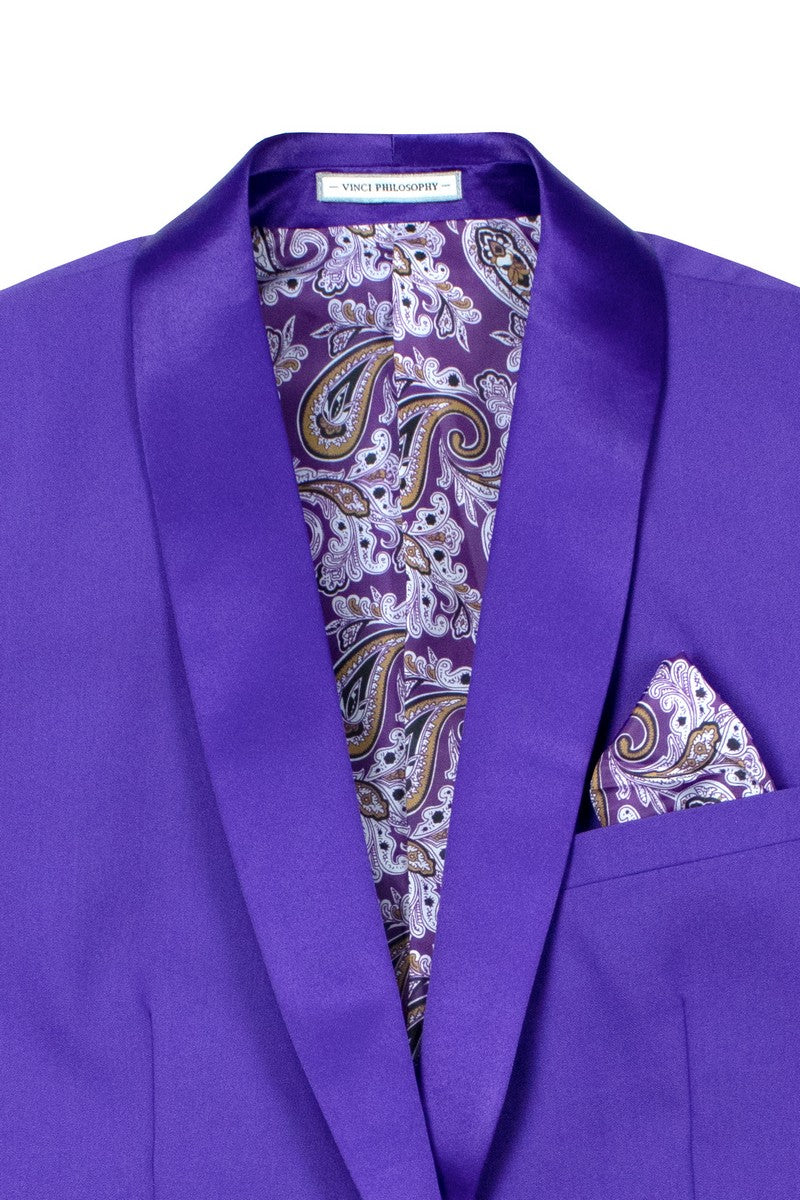 Step into elegance with the royal purple 2-piece tuxedo from the Bellatrix Collection. This stunning ensemble, made with luxurious stretch fabric, features a single-breasted 1-button jacket with a shawl lapel, matching lining, and built-in pocket square. Flat front pants with an adjustable waistband complete this bold and sophisticated look.