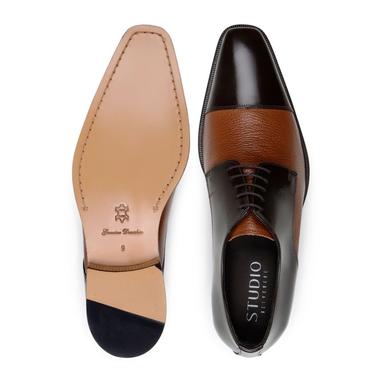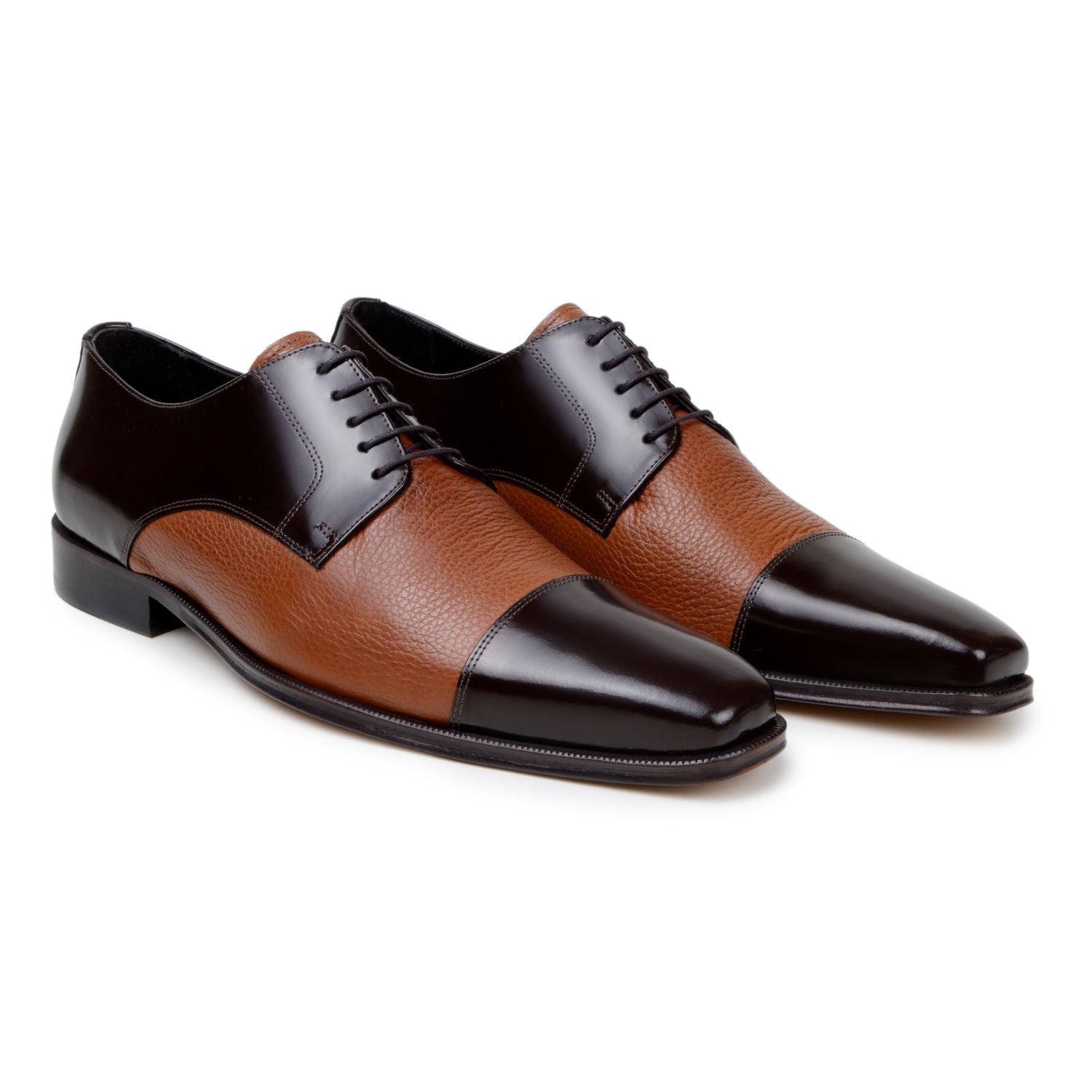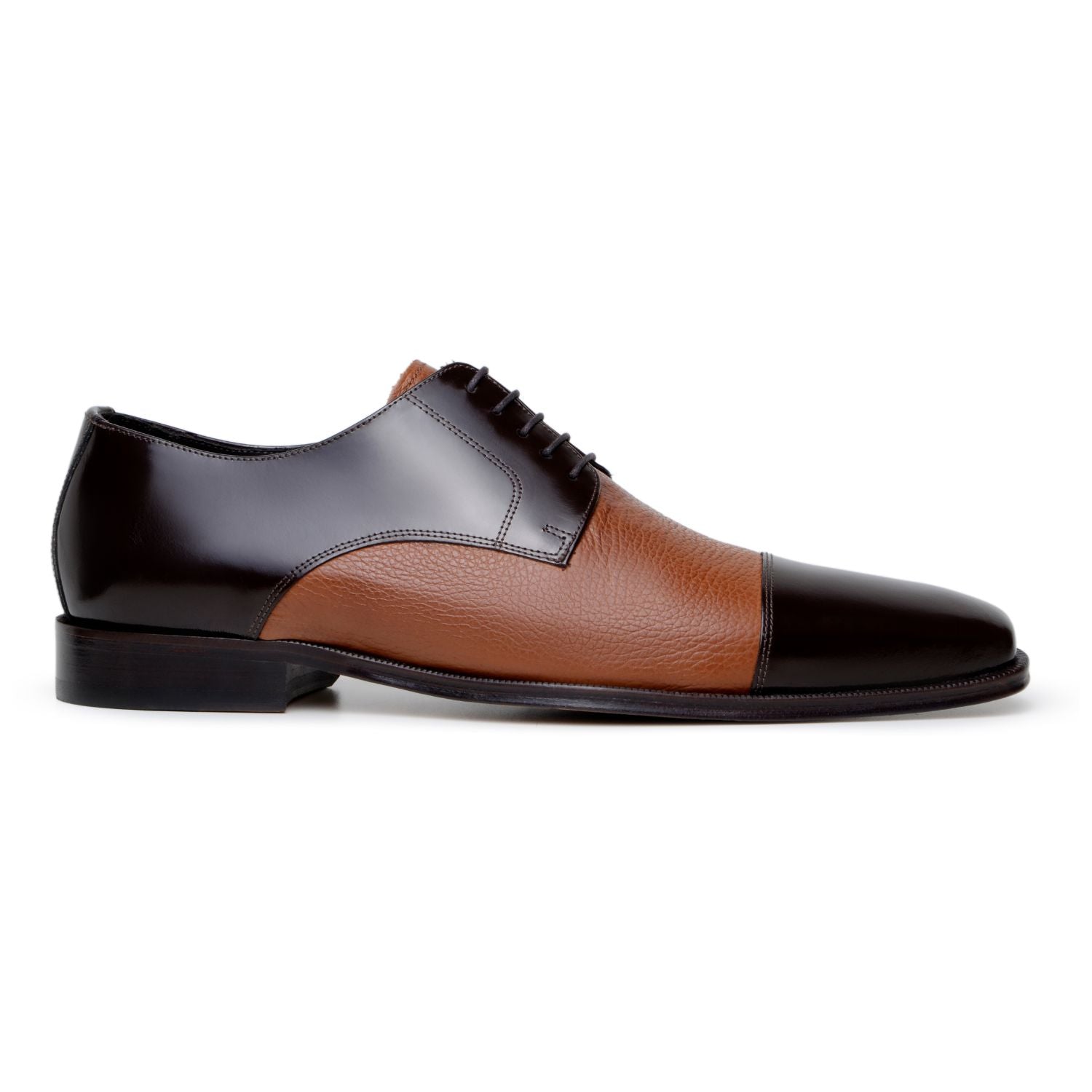 Classic and versatile, the brown and tan cap toe dress shoe from the Belvedere Alexander Collection blends rich tones with refined craftsmanship. Made from premium Italian deerskin and smooth nappa leather, this handcrafted shoe features an elongated toe and cushioned comfort that’s built for every occasion that calls for timeless polish.