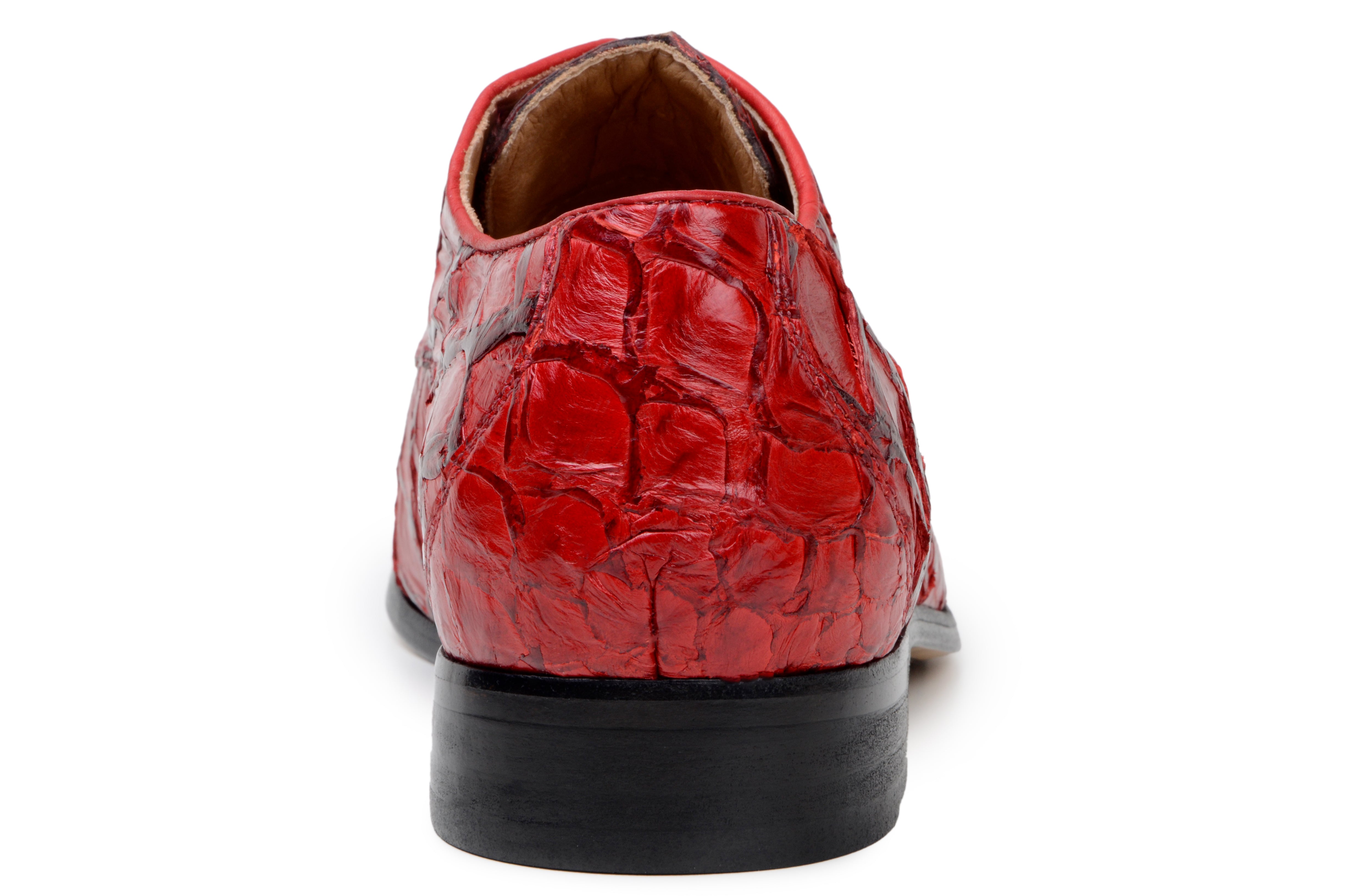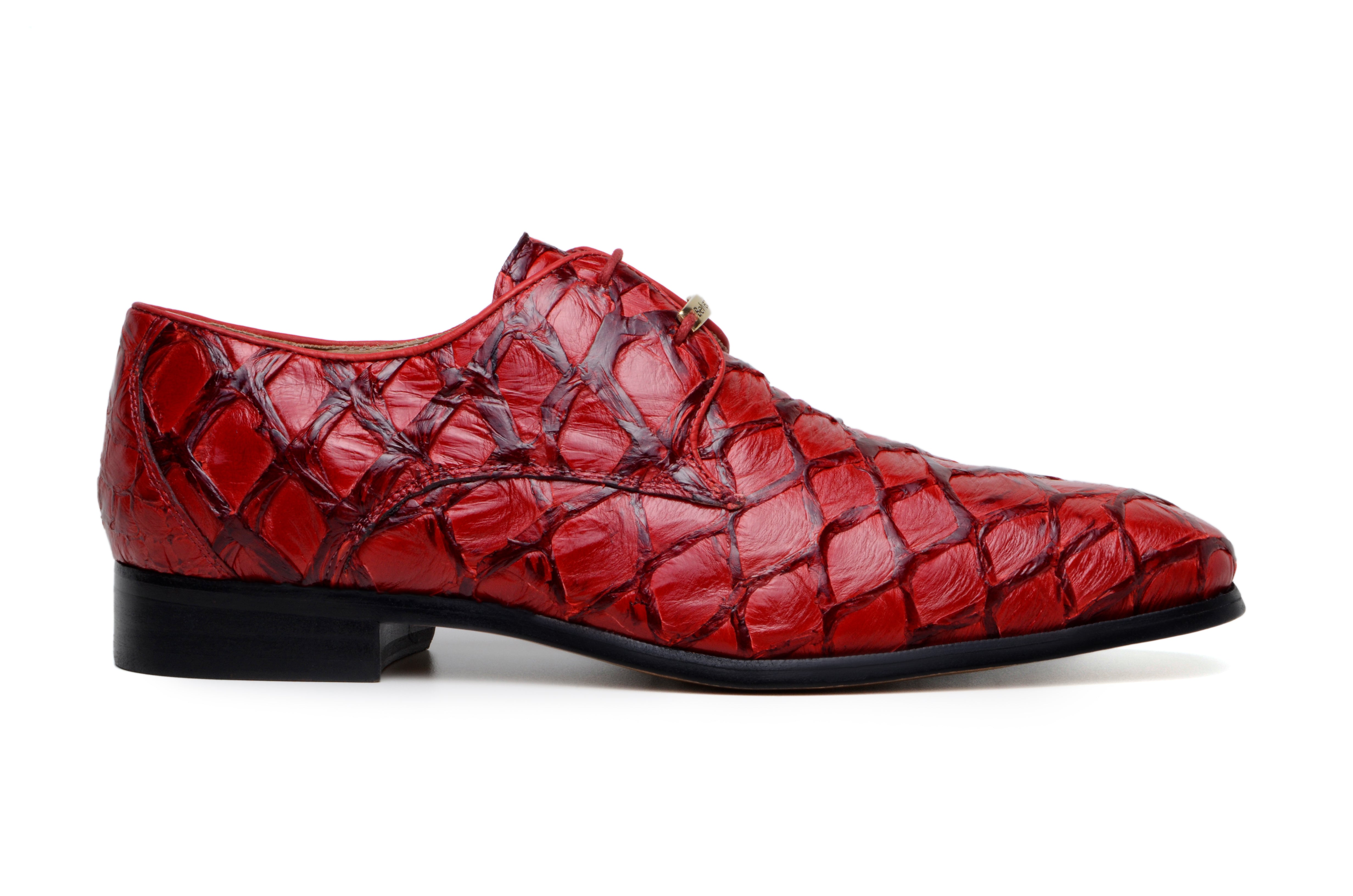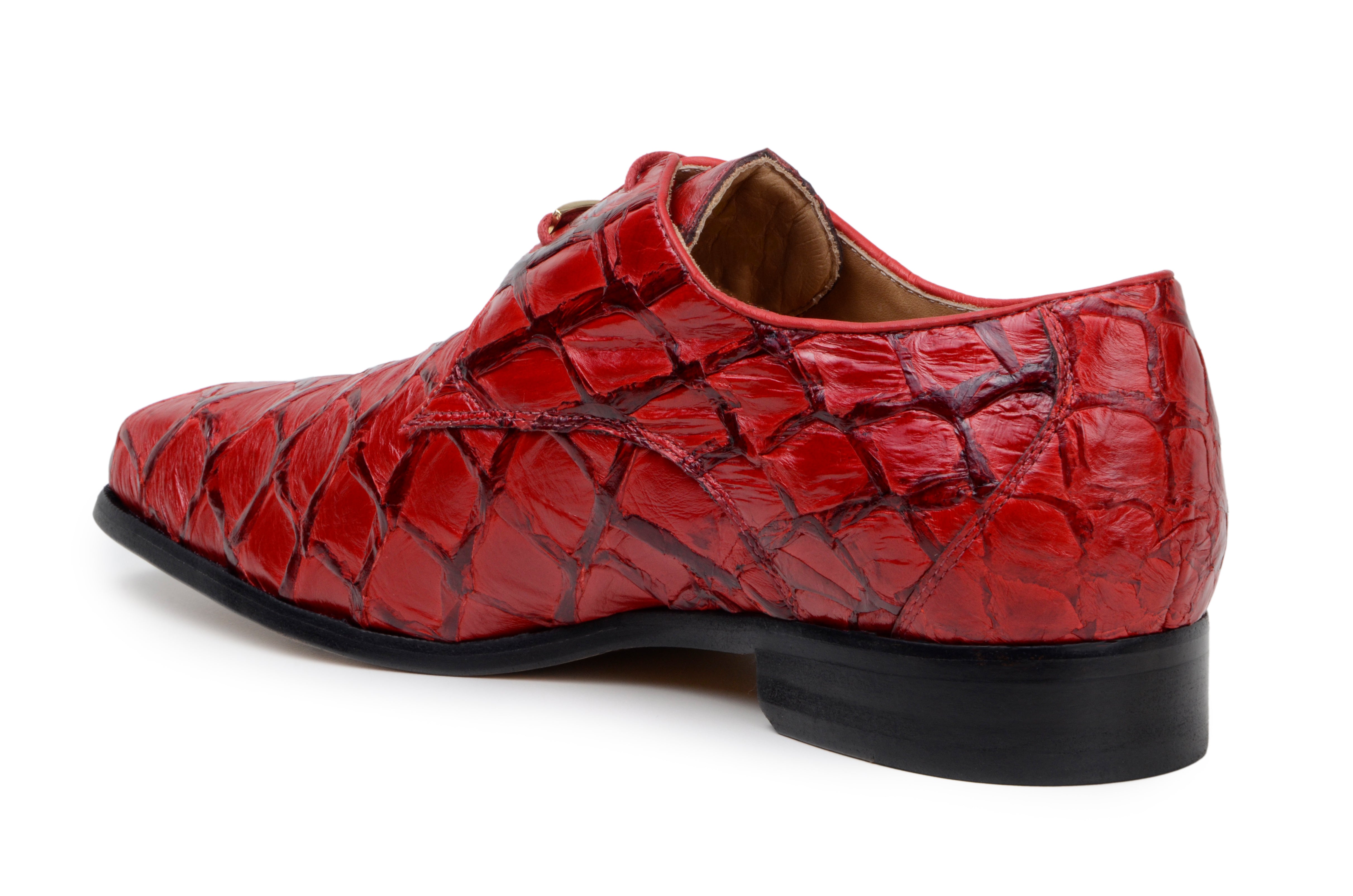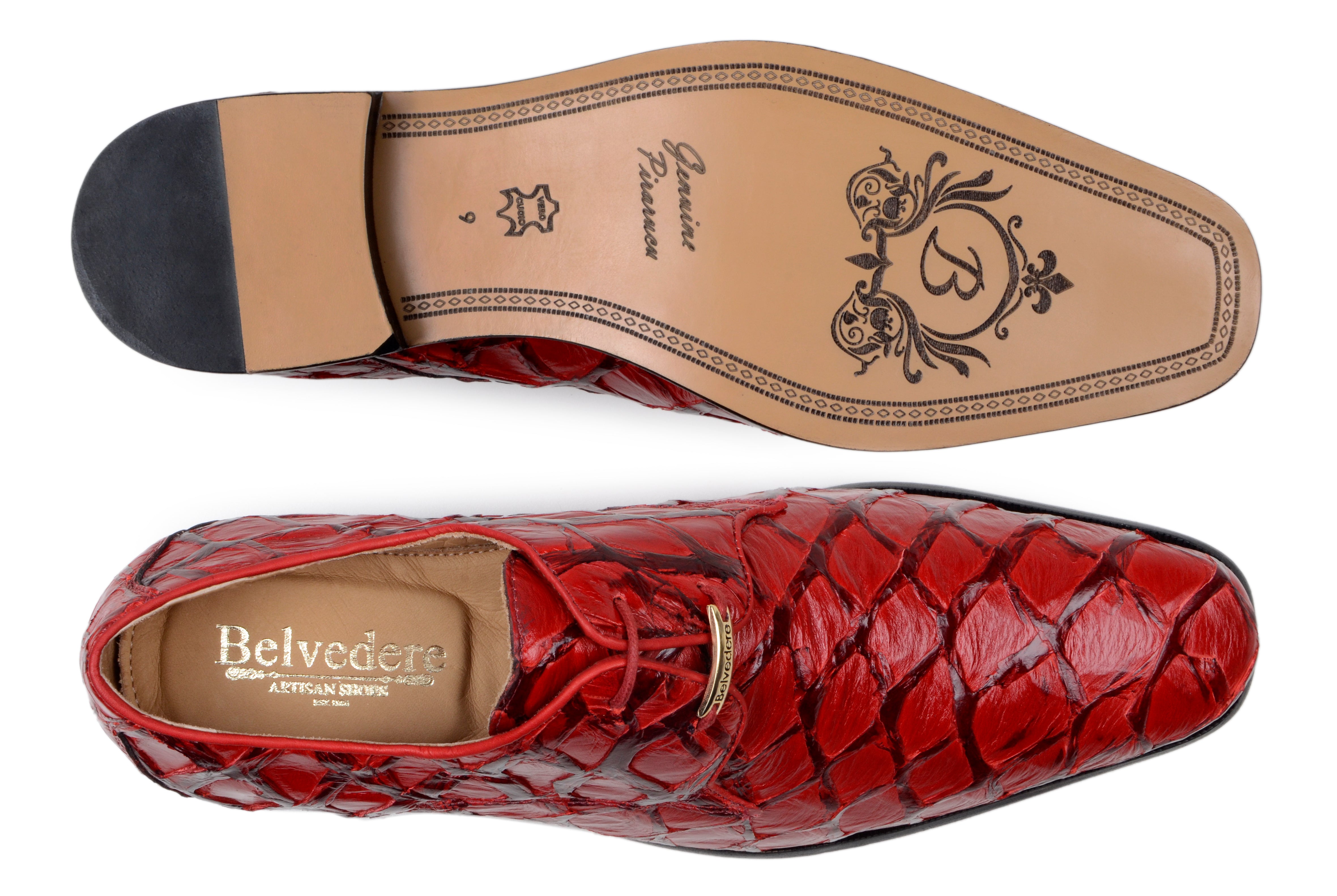 A bold take on timeless elegance, the Belvedere Renzo in red blends exotic pirarucu leather with a lace-up moc toe design, creating a confident and refined look. The deep red hue enhances the natural scale pattern, making this pair a conversation starter at any event. Designed for comfort and durability, it features a soft leather lining, cushioned insole, and a sturdy leather outsole.