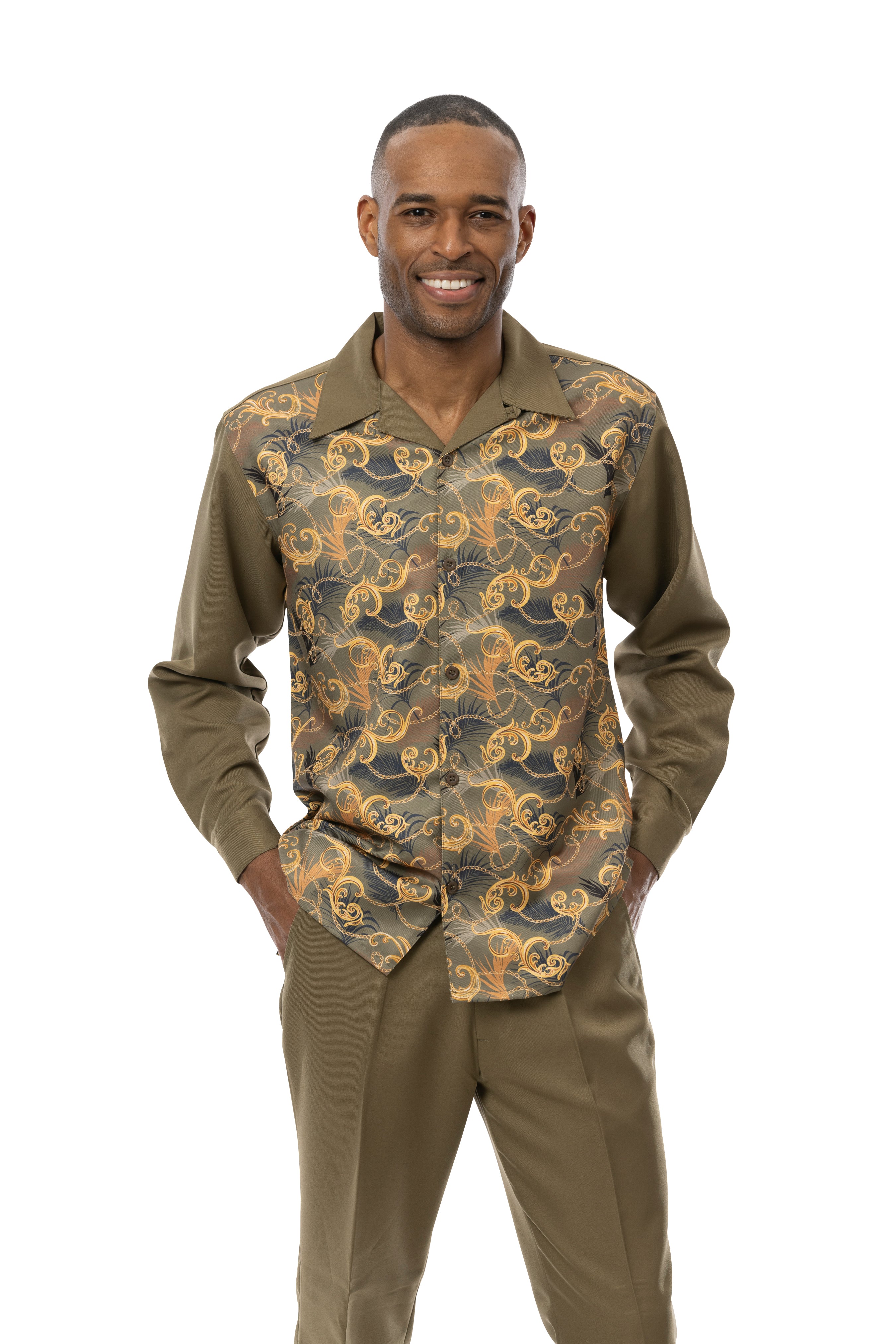 Bequeathal Collection: Olive Print Design Walking Suit 2 Piece Long Sleeve Set 2374