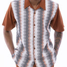 Step out in vibrant style with Montique’s Betelgeuse Collection Cognac walking suit. The short-sleeve button-down shirt features a dynamic wave-inspired pattern in shades of Cognac, grey, and white, adding energy and sophistication to your look. The matching solid Cognac pants complete this standout ensemble. Designed with an adjustable waistband for all-day comfort, this lightweight and versatile set is perfect for casual gatherings or lively outings.