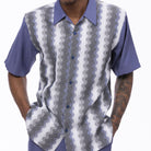 Step out in vibrant style with Montique’s Betelgeuse Collection Navy walking suit. The short-sleeve button-down shirt features a dynamic wave-inspired pattern in shades of Navy, grey, and white, adding energy and sophistication to your look. The matching solid Navy pants complete this standout ensemble. Designed with an adjustable waistband for all-day comfort, this lightweight and versatile set is perfect for casual gatherings or lively outings.