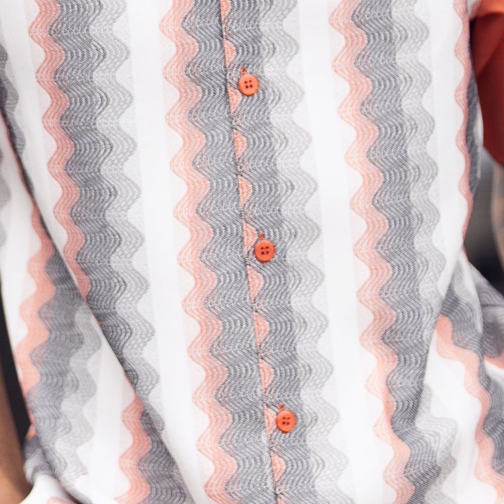 - Salmon base with wave-inspired patterns in grey and white