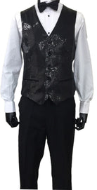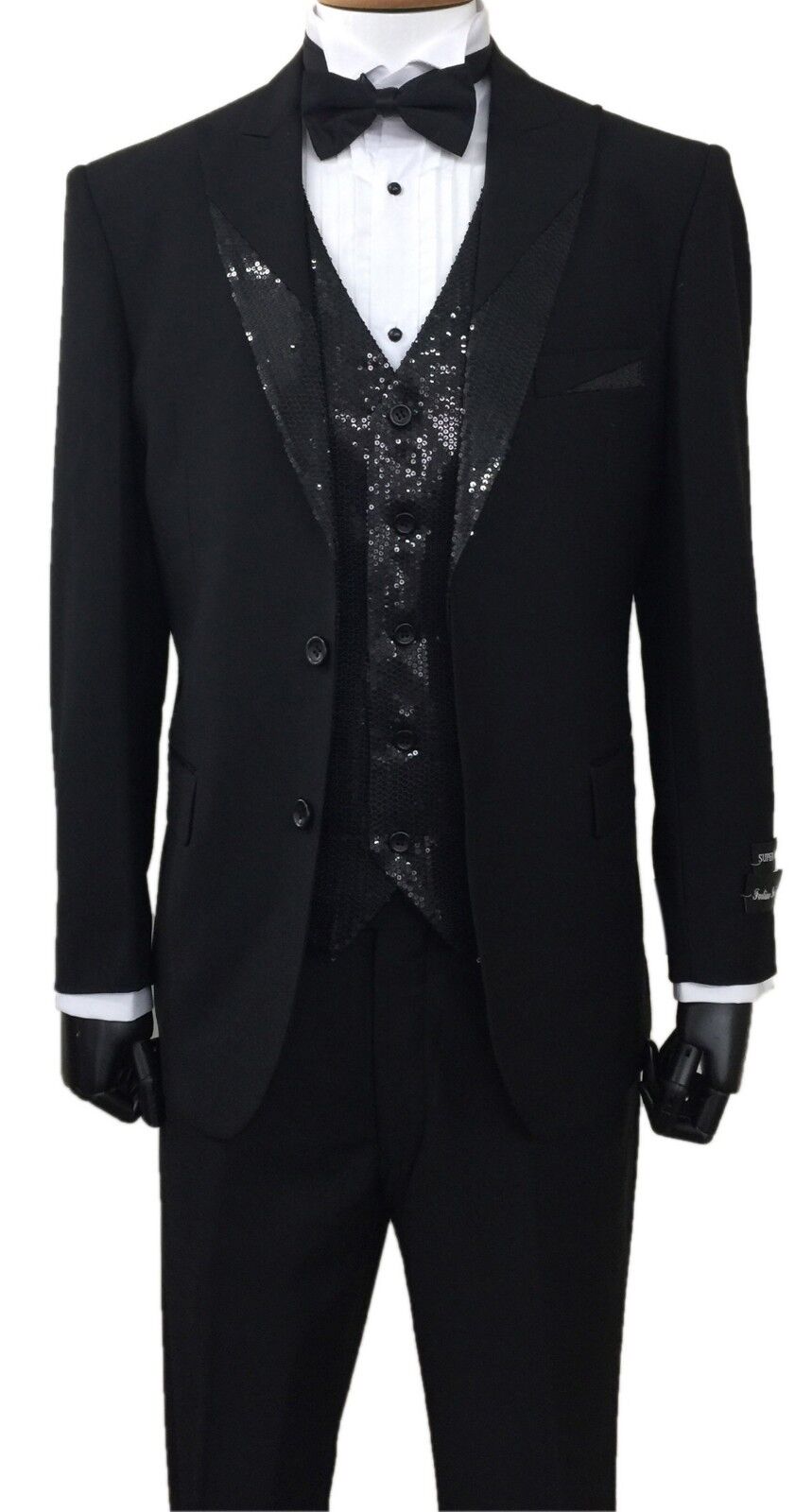 Make a bold and confident entrance in our Men's Black 3 Piece Slim Fit Tuxedo, and exude an unstoppable aura. This tuxedo is designed to make a statement with its sequins, adjustable waistband, and premium wool feel, elevating your style and comfort. Available in regular and long fit sizes, you can select the perfect fit to ensure you look and feel your absolute best. This tuxedo is perfect for transforming any ordinary evening into an extraordinary one.