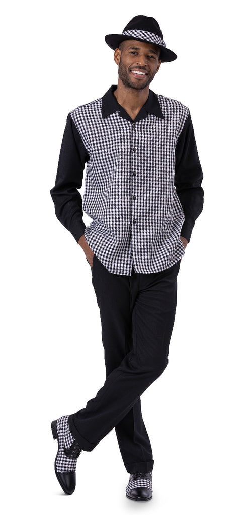 Eulogized Collection's Black Chequered Design 2 Piece Long Sleeve Walking Suit Set Long Sleeve Walking Suit Collar Chequered Design Button Closure Shirt.