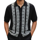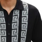 The shirt is built with a patterned knit front that uses a Greek key motif to create a more defined and structured look through the center. The sleeves, collar, and back stay cleaner for balance, while the matching pants complete the outfit with a coordinated solid finish. The result is a set that stands out visually without feeling overloaded.