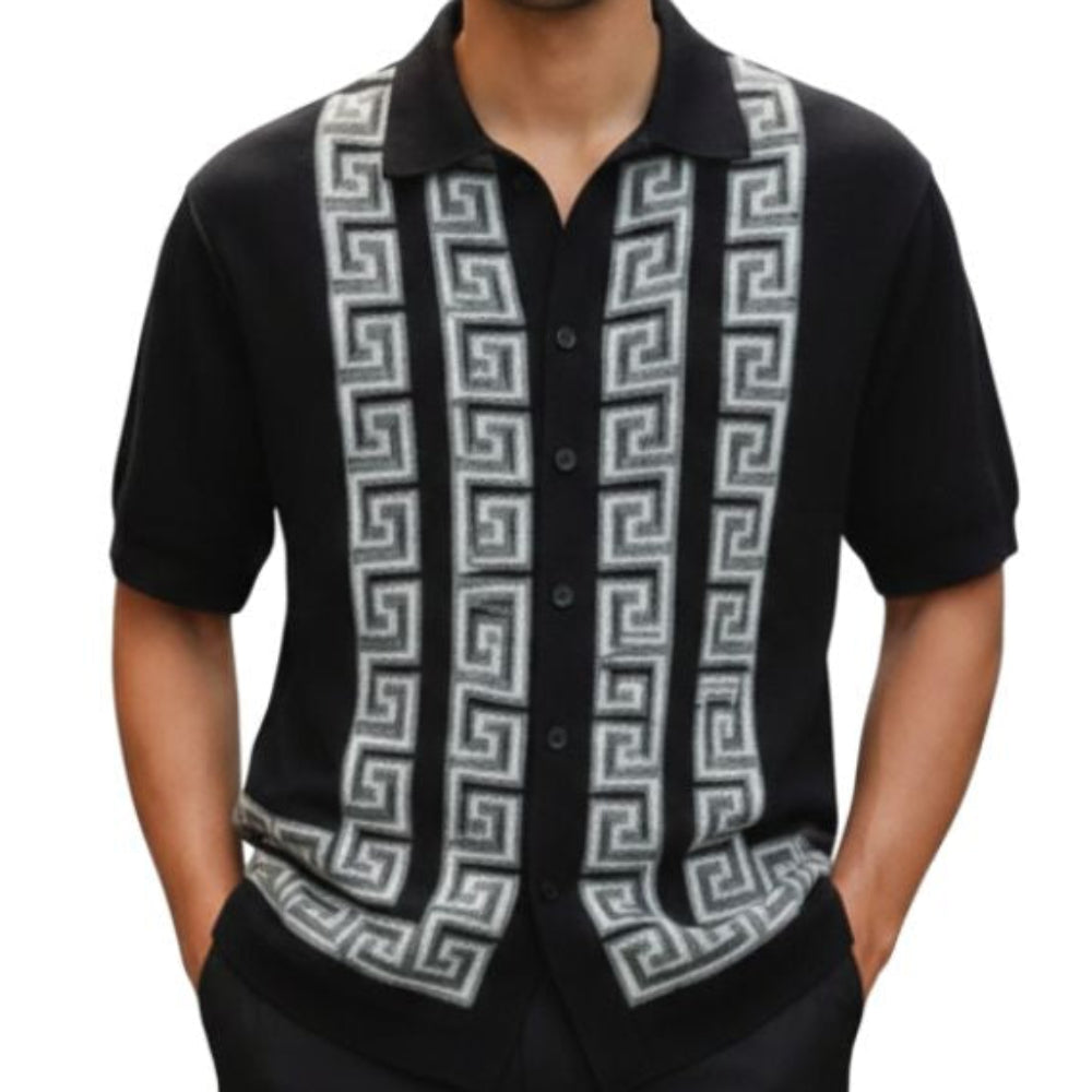 Part of the Crestview Collection, this 2-piece walking suit set includes a short sleeve button-front shirt with a Greek key knit front and matching solid pants. The front panel adds strong visual structure through repeated geometric framing, while the coordinated pants keep the set balanced and easy to wear.