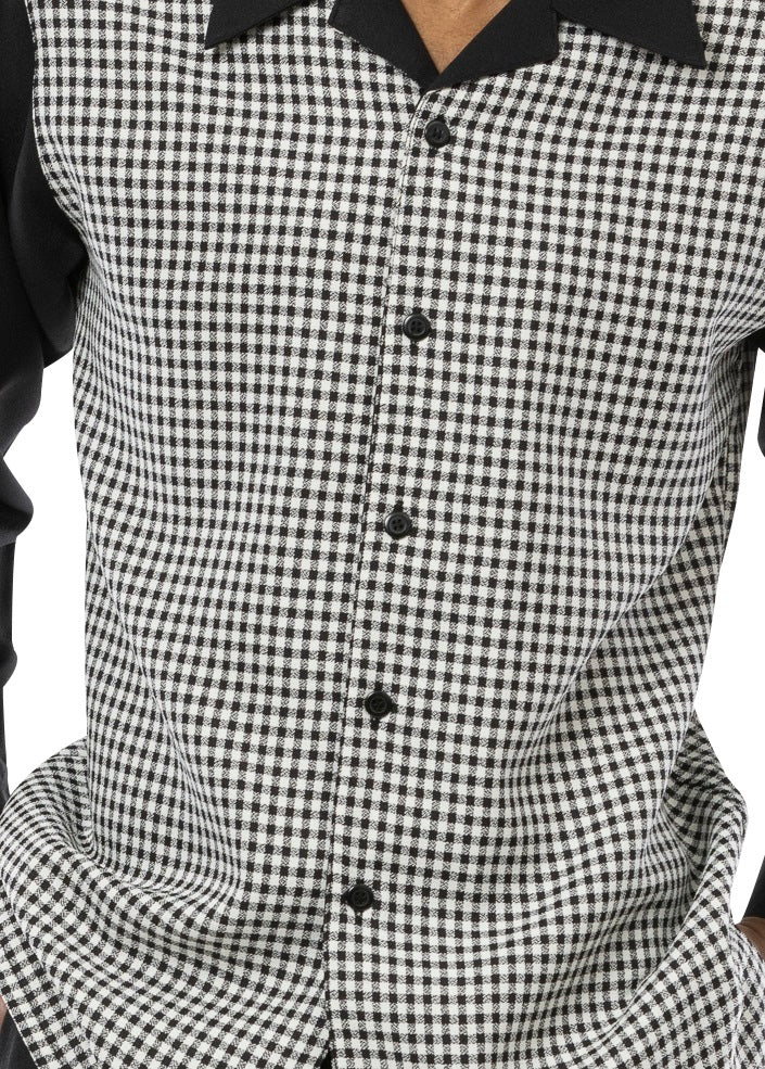 Introducing our Blotchy Collection's 2-Piece Checkered Walking Suit, a perfect blend of style and comfort for the modern man. This ensemble features a sleek black checkered shirt and matching navy pants, with an additional option to purchase the matching hat and shoes separately.