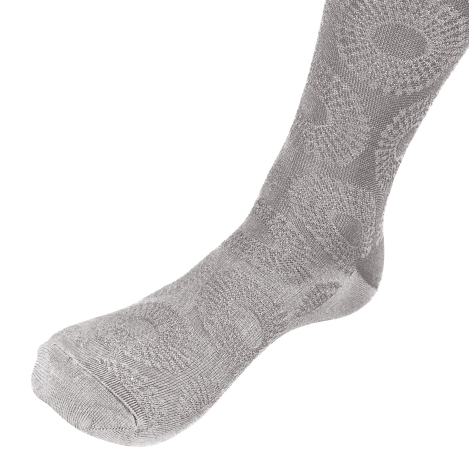 Add instant personality below the cuff. This silver sock features a detailed jacquard-knit pattern of repeating circular textures-like tonal medallions that catch the light just right. From weekday slacks to weekend suits, it brings a smooth statement to your step.