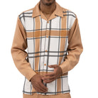 Two-piece set with a brown long sleeve plaid shirt (Camel with white and grey) and matching solid Camel pants. Shirt has an open collar and button front. Pants are flat front with an adjustable waistband.