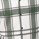 Two-piece set with a brown long sleeve plaid shirt (Hunter with white and grey) and matching solid Hunter pants. Shirt has an open collar and button front. Pants are flat front with an adjustable waistband.