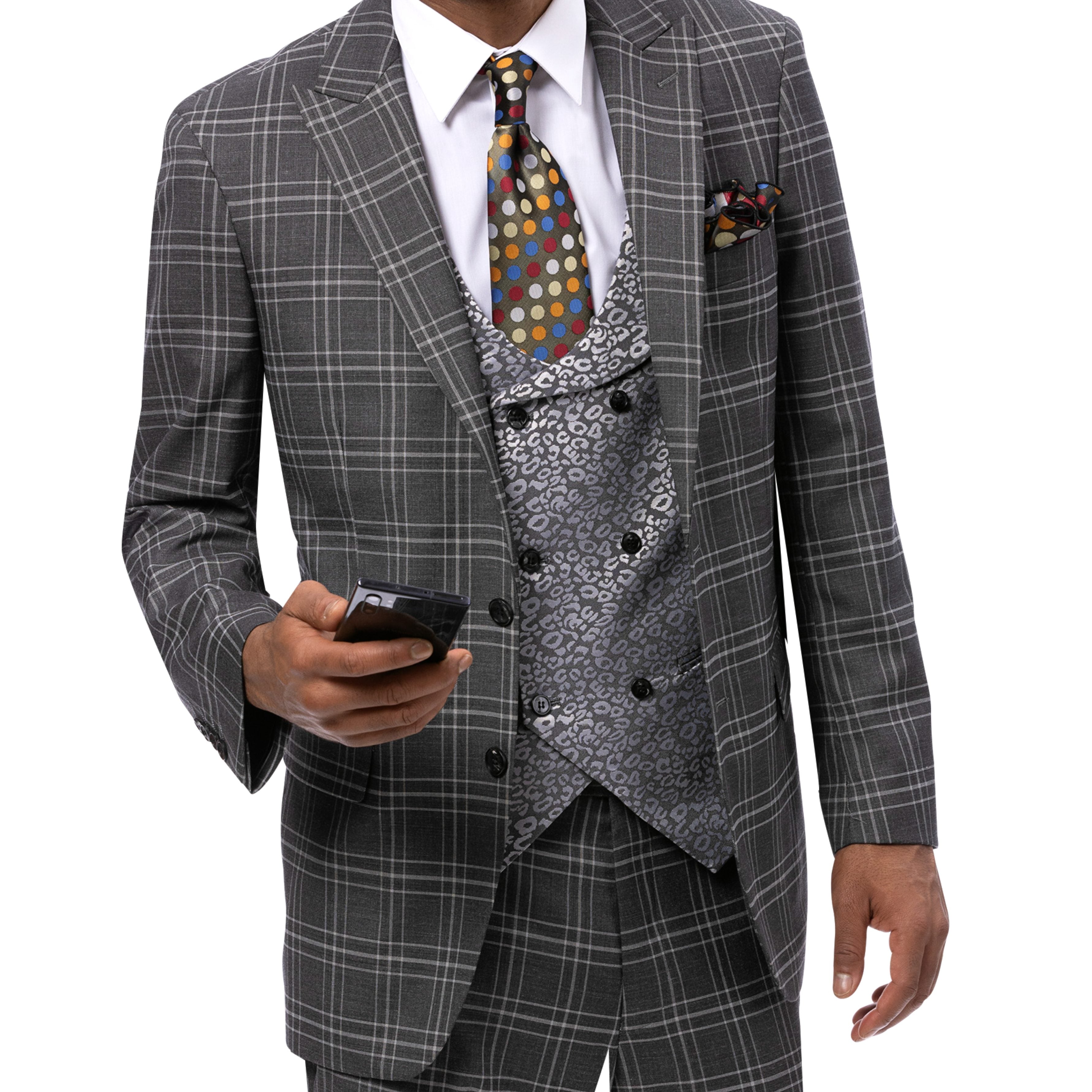 - Vest: Stylish double-breasted grey patterned vest that adds depth and contrast.