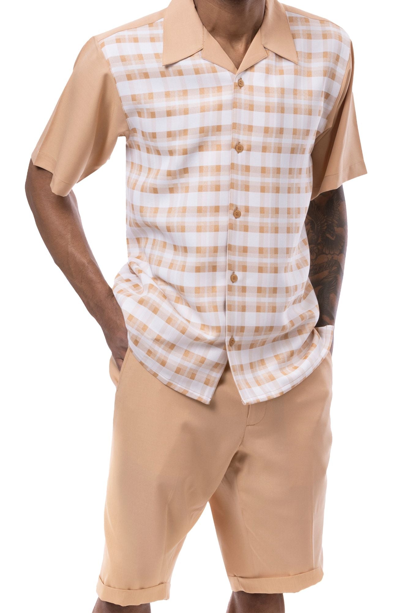 Charm Collection: Montique Checker Plaid 2-Piece Walking Suit Shorts Set in Tan