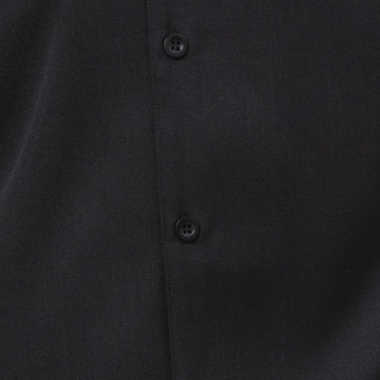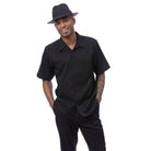 This two-piece walking suit from the Charpi Collection features a short-sleeve button-down shirt with a linen-look textured surface paired with matching solid black pants. The fabric has a soft hand feel with visual texture that adds depth without patterning. Lightweight construction and an adjustable waistband keep the set comfortable and easy to wear for warm-weather occasions.