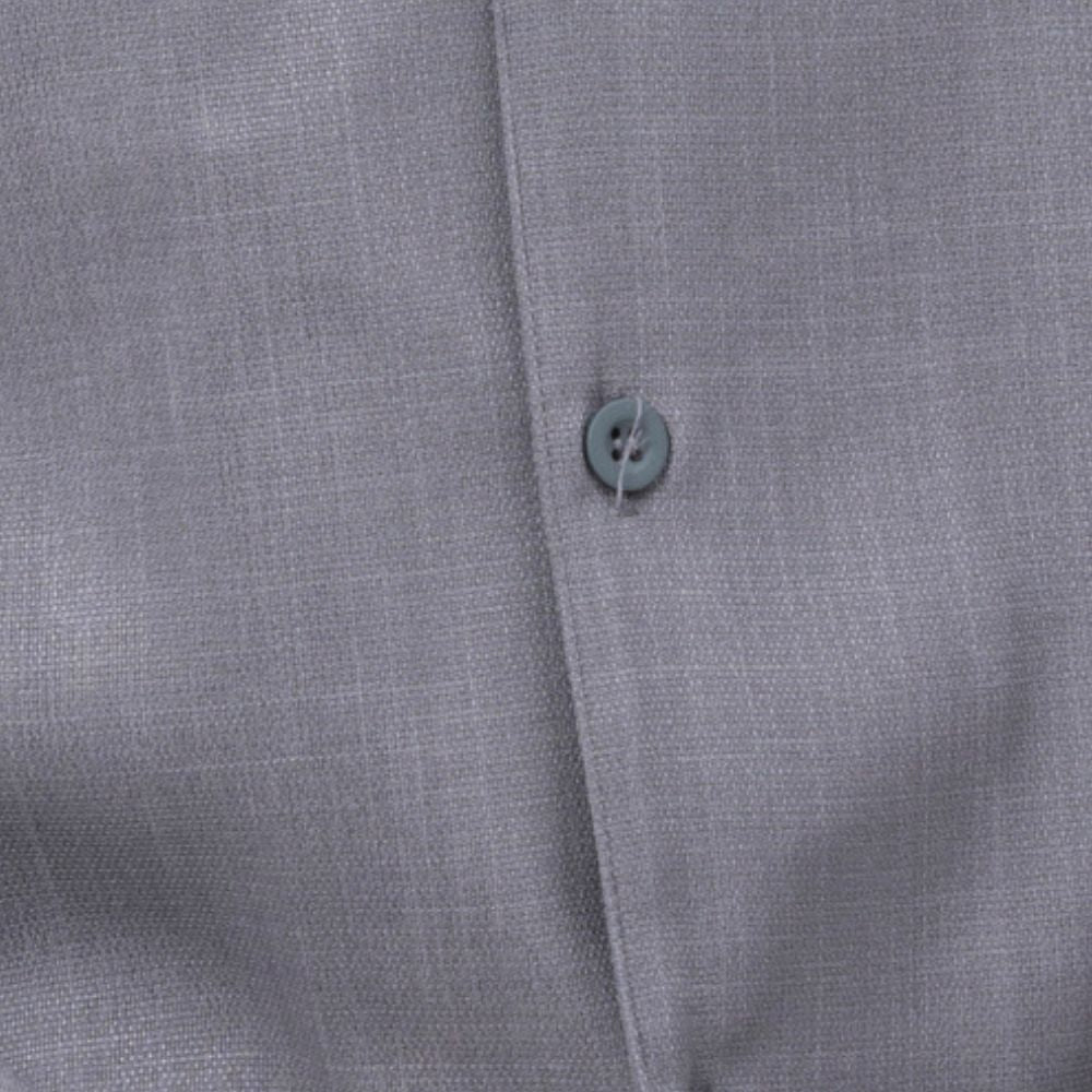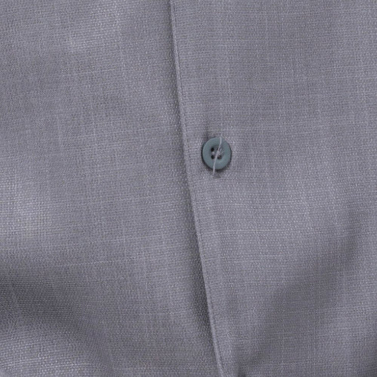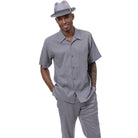 This two-piece walking suit from the Charpi Collection features a short-sleeve button-down shirt with a linen-look textured surface paired with matching solid grey pants. The fabric has a soft hand feel with visual texture that adds depth without patterning. Lightweight construction and an adjustable waistband keep the set comfortable and easy to wear for warm-weather occasions.