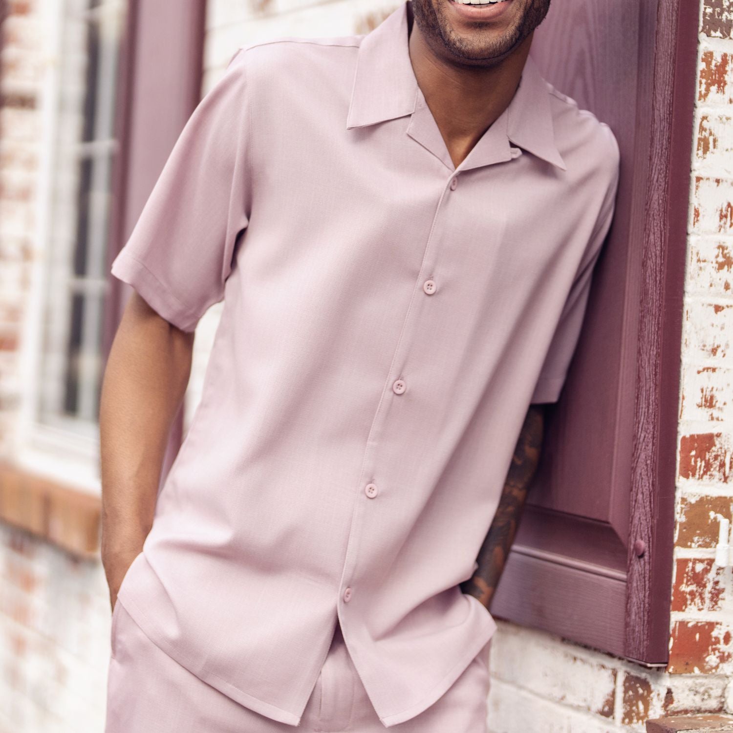Montique’s Charpi Collection radiates timeless charm with this Mauve walking suit. The short-sleeve button-down shirt features a soft, textured pattern that adds subtle elegance, perfectly paired with matching solid Mauve pants. The lightweight fabric and adjustable waistband provide comfort without compromising style, making this two-piece set ideal for casual outings, summer gatherings, or whenever you want to look effortlessly polished.