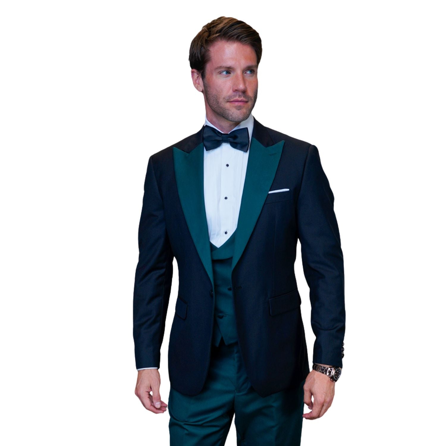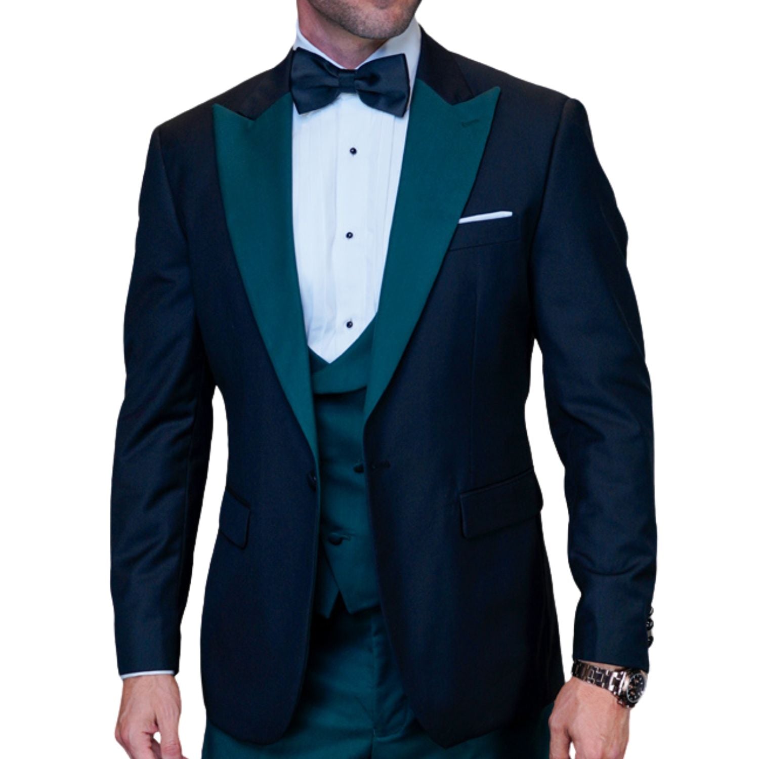 Elevate your formal wardrobe with the striking ChicChato Black and Hunter 3-Piece Tuxedo, a blend of contemporary styling and traditional elegance. This luxurious tuxedo, tailored from Super 150's Italian wool, features a bold Hunter peak lapel that vividly contrasts with the black of the jacket, creating a visually captivating look. The ensemble includes a Hunter vest and matching pants that seamlessly extend the color theme, providing a cohesive and polished appearance. Completed with a classic black bow tie, this tuxedo is ideal for weddings, formal parties, and any event where making a lasting impression is key.
