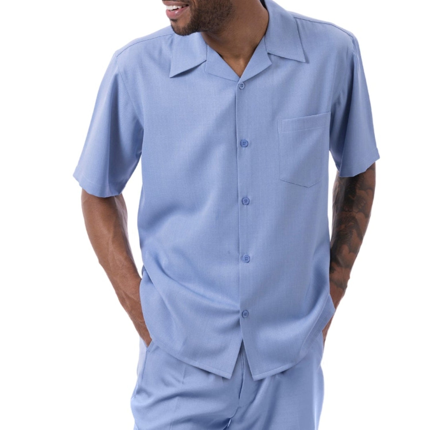 - Two-piece walking suit set with a short-sleeve shirt and single-pleat pants