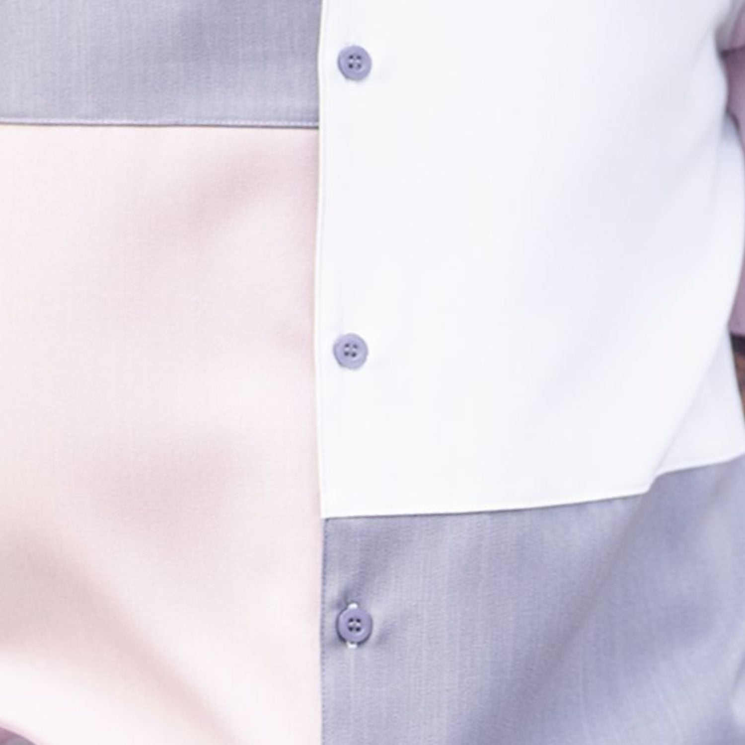 The shirt is built with a button-up front and structured color block panels that create a modern, geometric layout. The contrast sections are positioned to give the shirt a sharp, styled appearance without adding bulk.