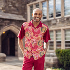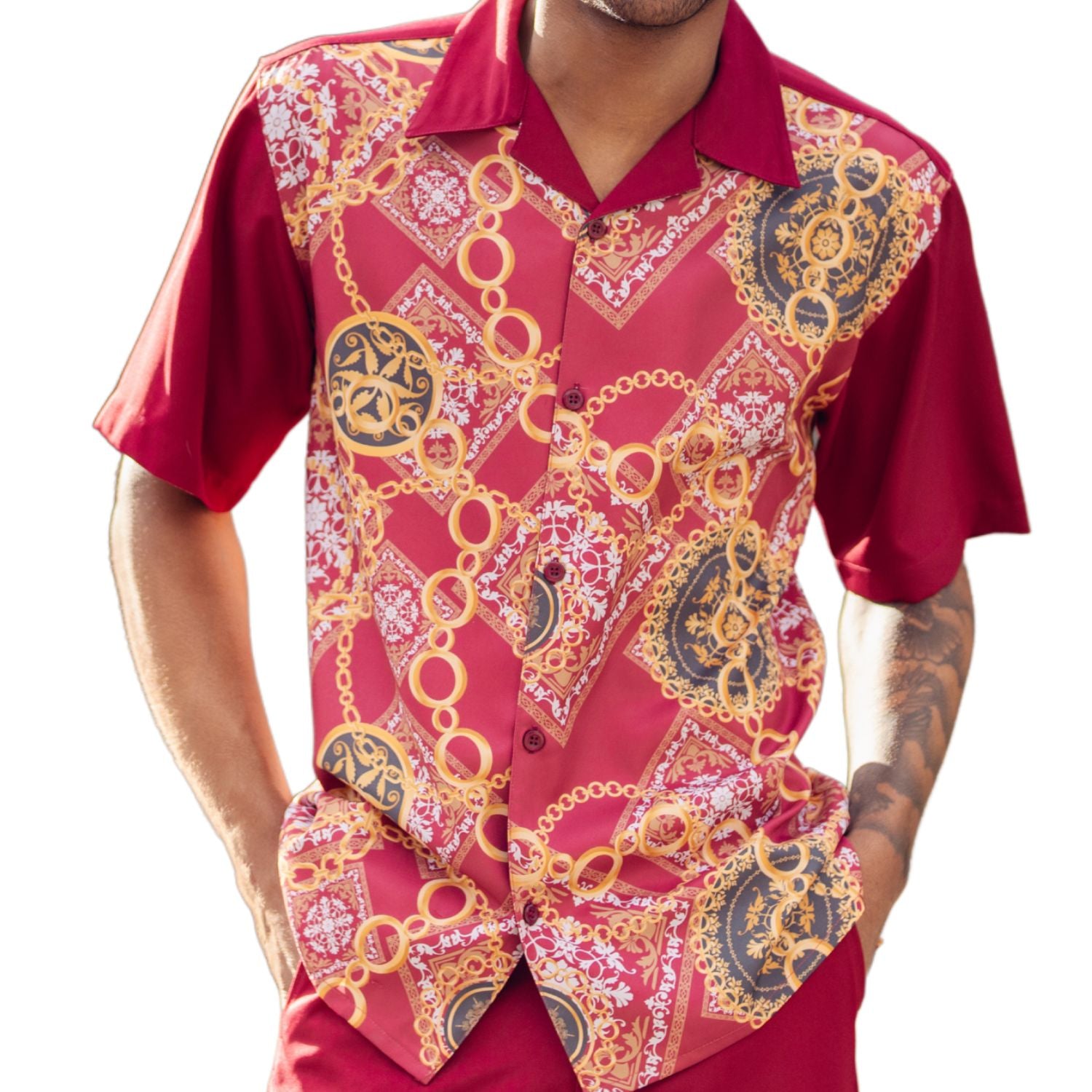 The Coronal Collection by Montique brings a luxurious flair to your wardrobe with this Burgundy walking suit. The short-sleeve button-down shirt features an intricate gold chain print, accented with floral and medallion motifs, creating a striking and elegant design. Paired with solid Burgundy pants, this two-piece set exudes sophistication while offering exceptional comfort. The adjustable waistband ensures a perfect fit, making it an excellent choice for stylish outings and special occasions.