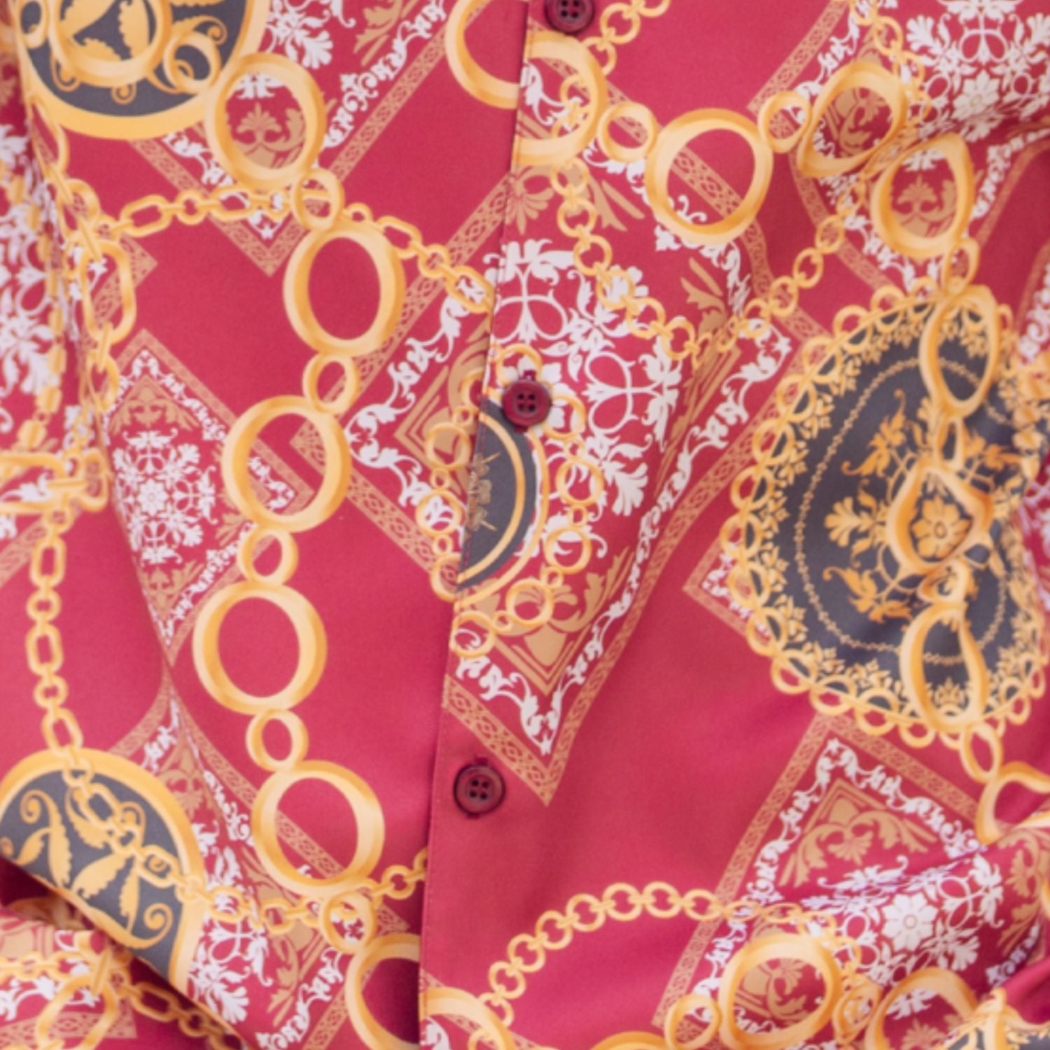 - Elegant Burgundy base with a luxurious gold chain, medallion, and floral print