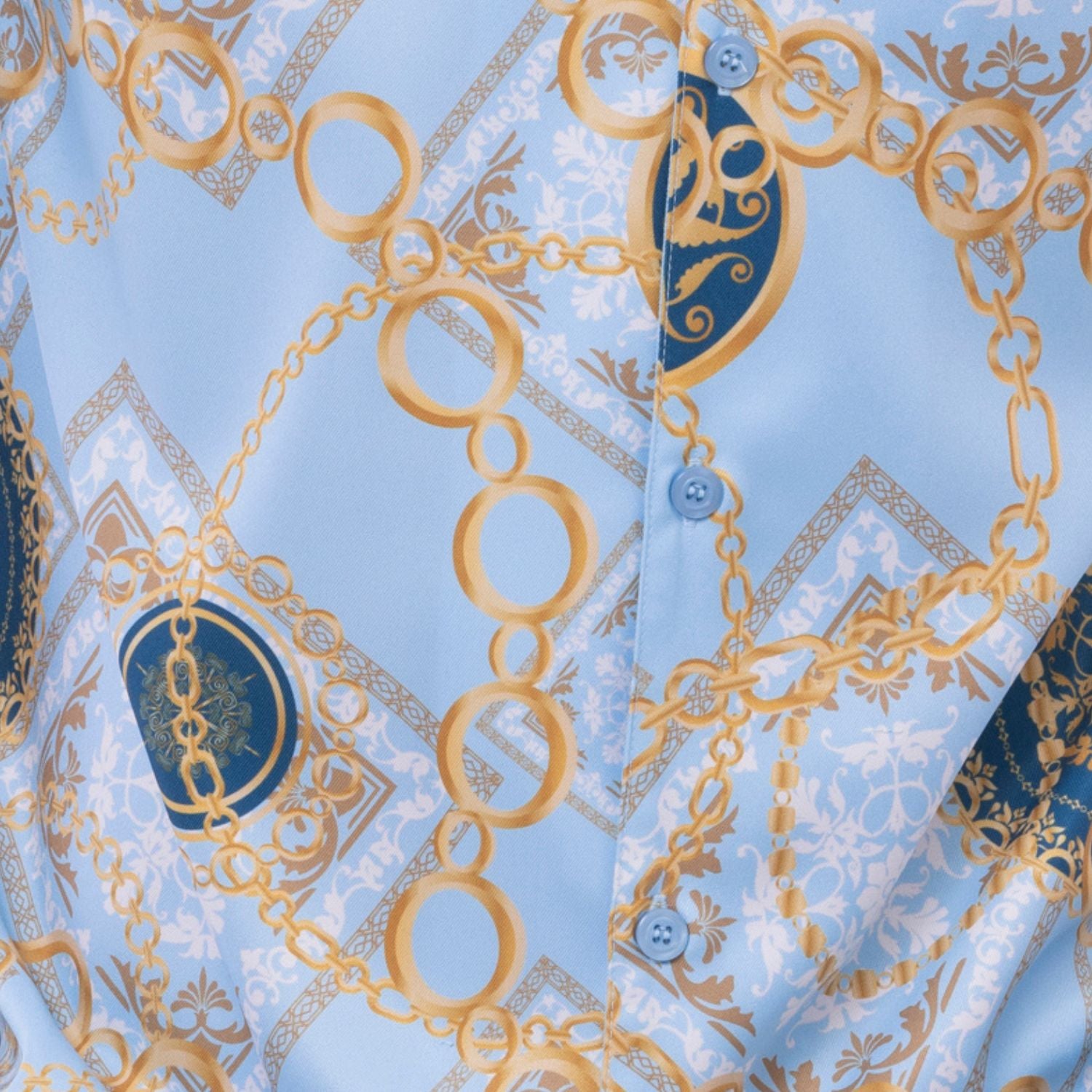 - Elegant Lt Blue base with a luxurious gold chain, medallion, and floral print