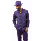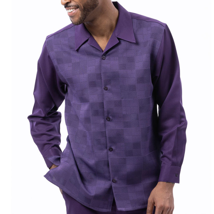 Two-piece walking suit featuring a grape long sleeve shirt with a woven checkerboard jacquard pattern. Includes solid matching pants. Shirt has an open collar, button-front design, and a regular fit. Pants are designed to coordinate cleanly with the shirt.