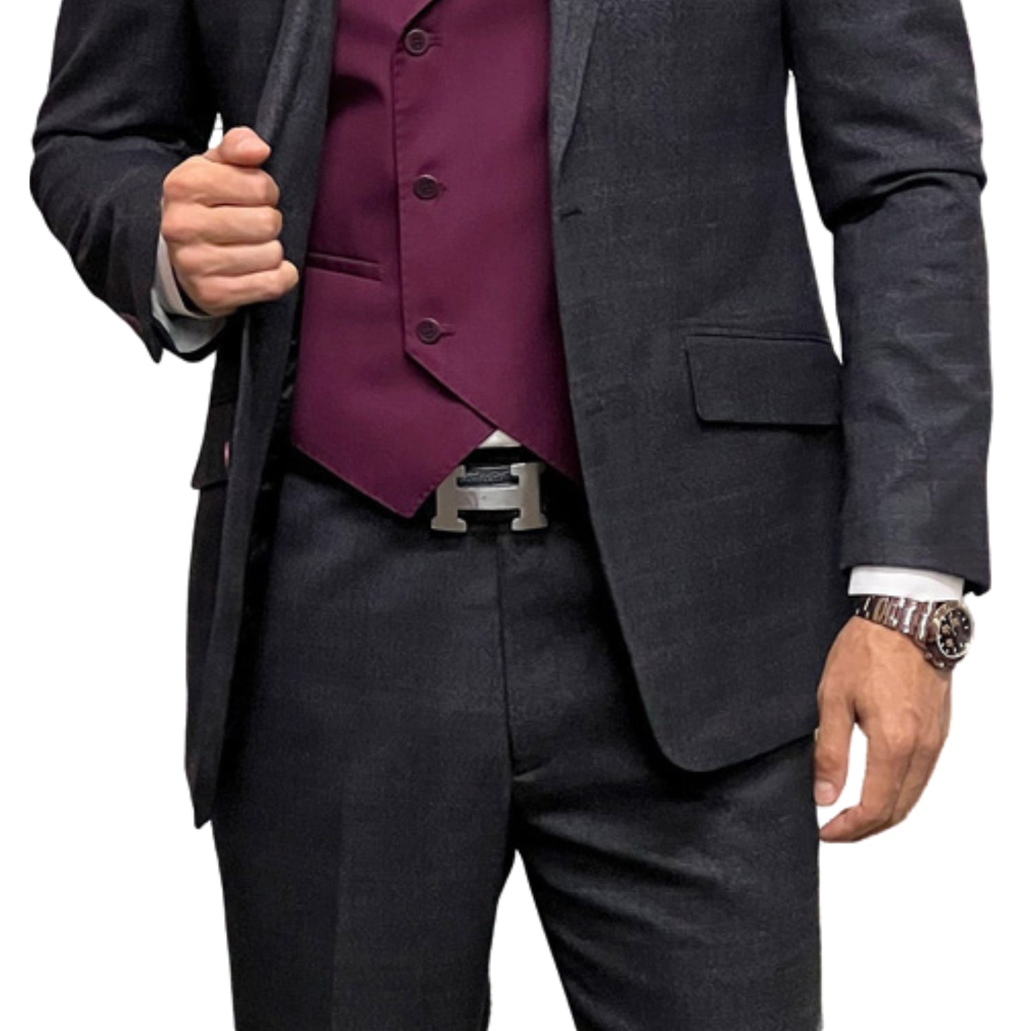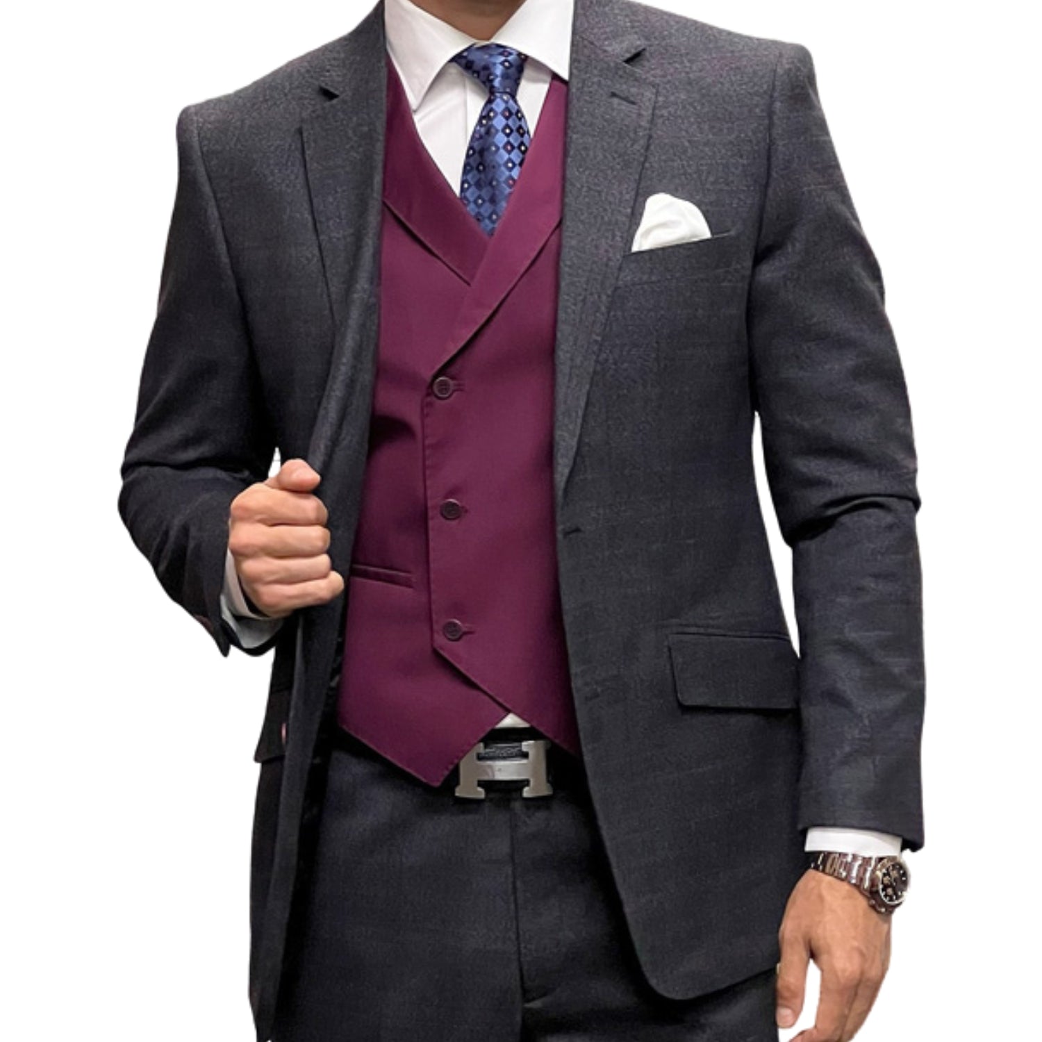 Elevate your style with the Dapperique Collection Charcoal Plaid 3-Piece Suit, meticulously crafted from a blend of Super 200's Italian wool and cashmere. This ensemble features a notch lapel jacket with two side vents, complemented by a contrasting solid color double-breasted vest that sharpens any formal look. The modern fit flat front pants, lined to the knee for comfort, complete this sophisticated outfit. Perfect for any season and occasion, this suit promises both style and comfort.