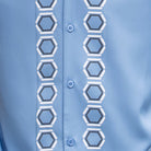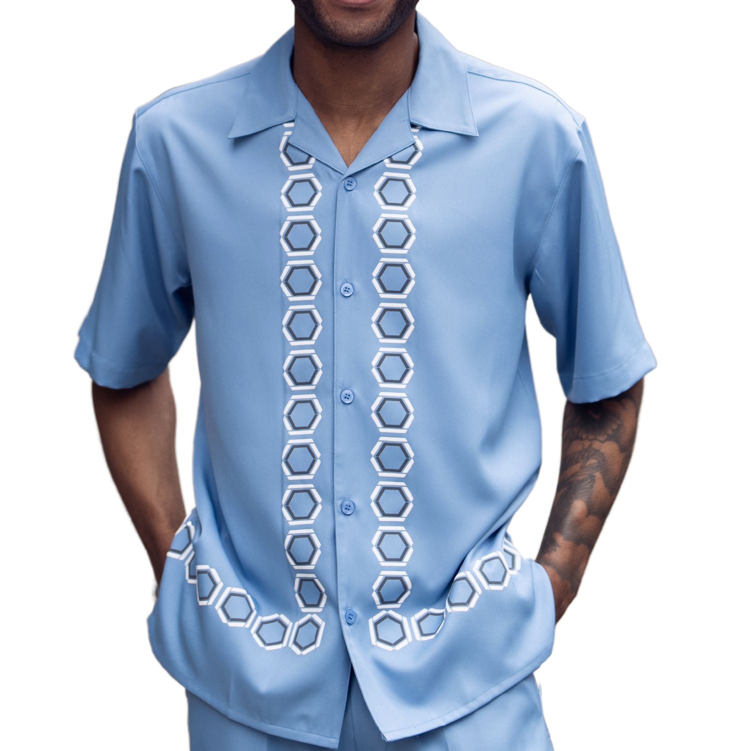 This walking suit from Montique’s Deimos Collection is a refined addition to your wardrobe. Featuring a Carolina hue, the short-sleeve button-down shirt is adorned with a striking geometric design down the front, creating a bold yet sophisticated look. The matching pants complete the ensemble, and the adjustable waistband ensures a comfortable and tailored fit. Perfect for evening gatherings, social outings, or any occasion that calls for effortless style.