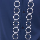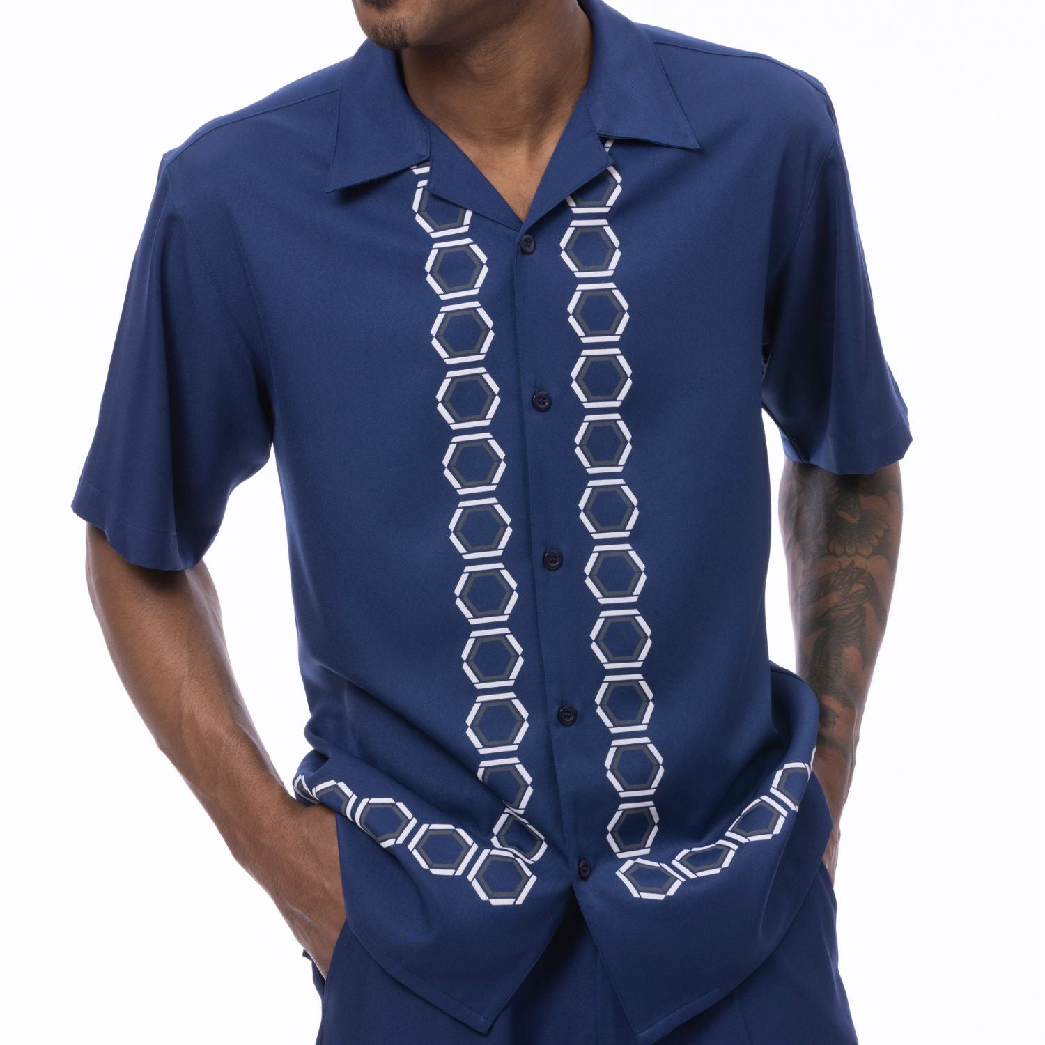 This walking suit from Montique’s Deimos Collection is a refined addition to your wardrobe. Featuring a rich Navy hue, the short-sleeve button-down shirt is adorned with a striking geometric design down the front, creating a bold yet sophisticated look. The matching pants complete the ensemble, and the adjustable waistband ensures a comfortable and tailored fit. Perfect for evening gatherings, social outings, or any occasion that calls for effortless style.