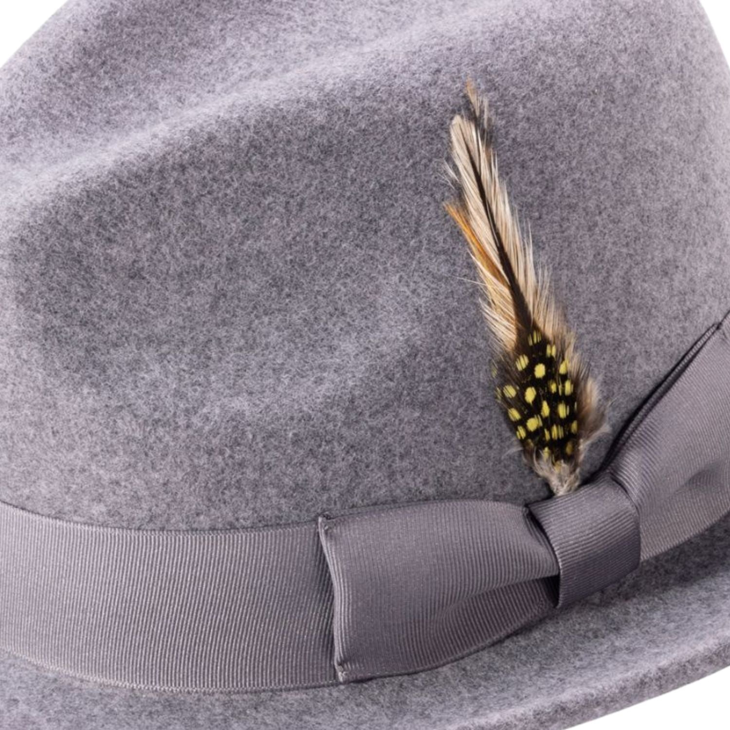 Upgrade your hat game with our Montique Grey Snap Brim Crushable Wool Felt Fedora Hat featuring a stylish feather accent. Crafted from 100% wool, this hat boasts a sophisticated pinch crown design and a classic 2" brim. Complete with a grosgrain ribbon for added charm, this hat exudes elegance and style. With no lining, it's lightweight and comfortable for all-day wear.