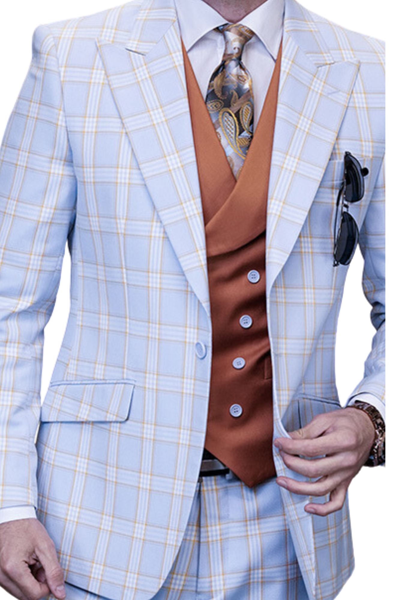 - Plaid pattern on the suit, solid color contrast on the double-breasted vest.