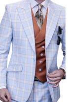 Step into luxury with our Blue 3-Piece Plaid Suit from the DrapeDreams Collection. Featuring a solid color contrast double-breasted vest and modern fit flat front pants, this ensemble is meticulously crafted from Super 180's Italian wool. It's modern elegance at its finest.