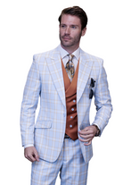 DrapeDreams Collection: Blue 3 Piece Plaid with Solid Color Vest Modern Fit Suit - FINAL SALE Size 52L/47 Waist