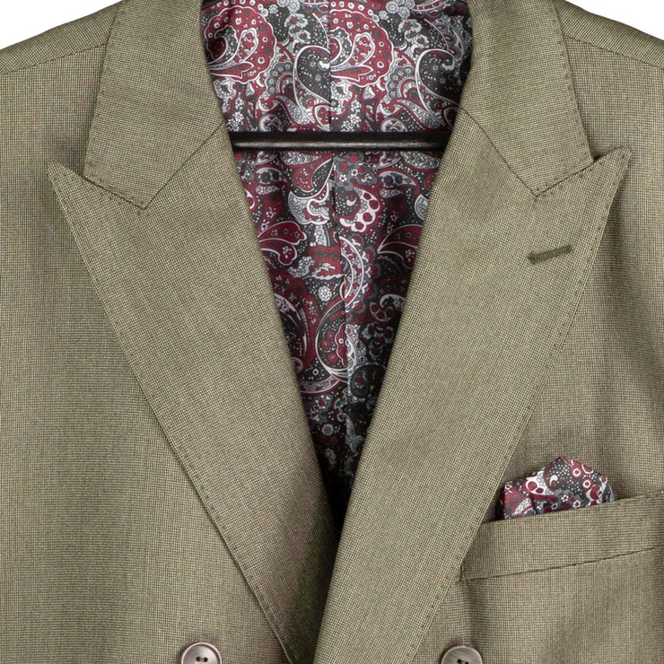 Two-piece double-breasted suit in dusty green with a luxury wool-feel hand. Jacket features a 6-button front, side vents, fancy lining, and a built-in pocket square. Flat-front pants. Subtle sharkskin finish gives the fabric a clean, lightly lustrous look.