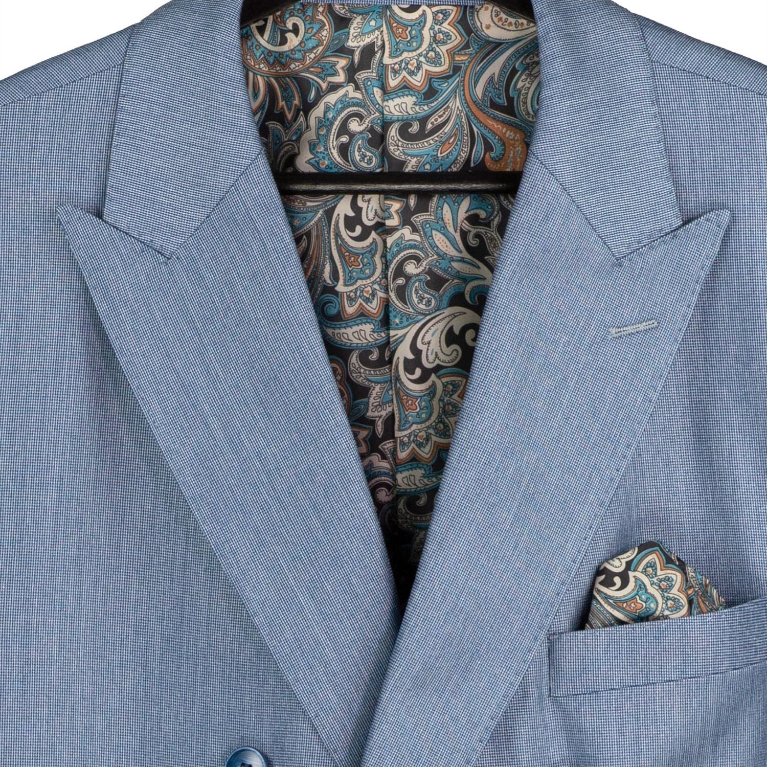 | Jacket | 6-button double-breasted, side vents, fancy lining, built-in pocket square |