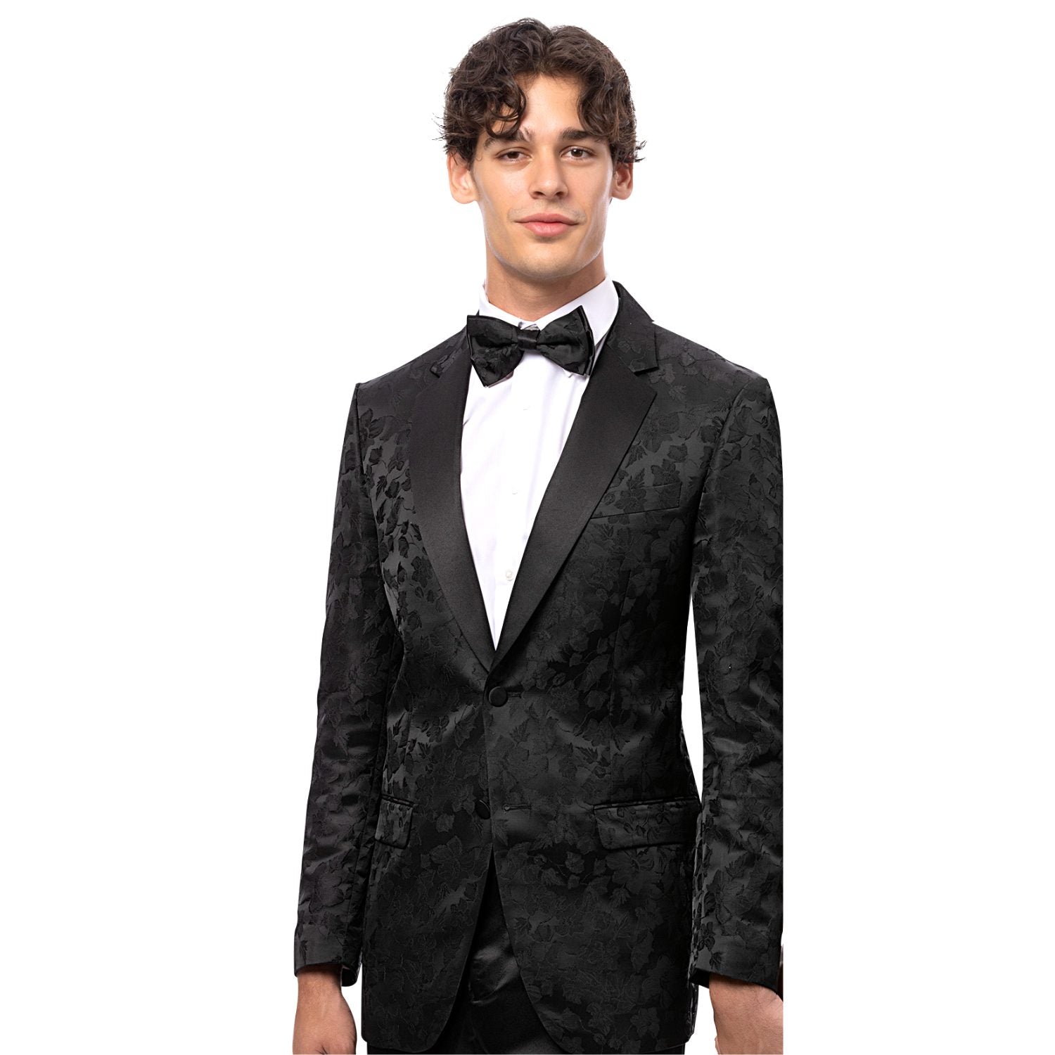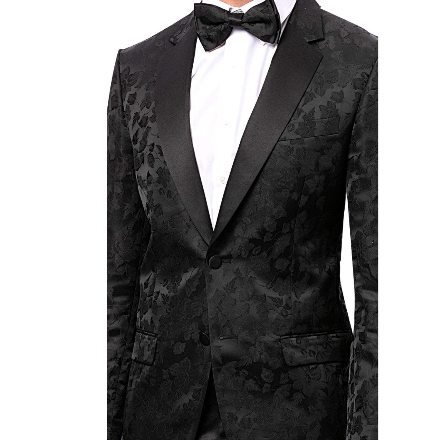 Elegant Black Tone on Tone Floral Design Blazer with Solid Satin Lapel - Modern Fit