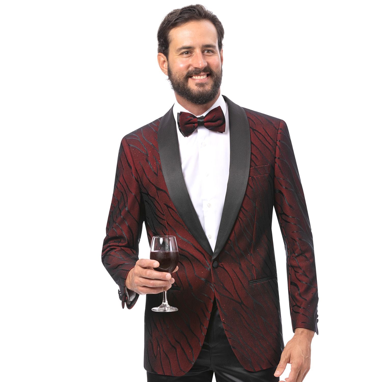 - Color: Vibrant wine with a deep textured design, complemented by a contrasting black satin peak lapel that enhances the Blazer's elegant appeal.