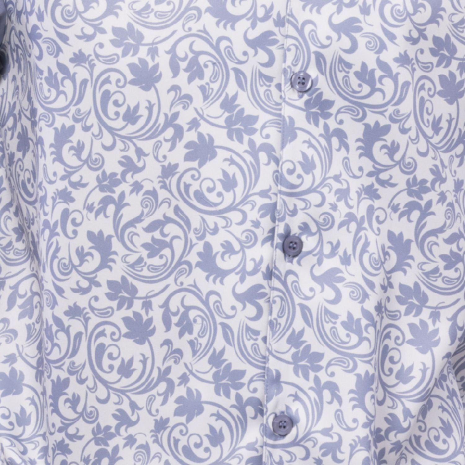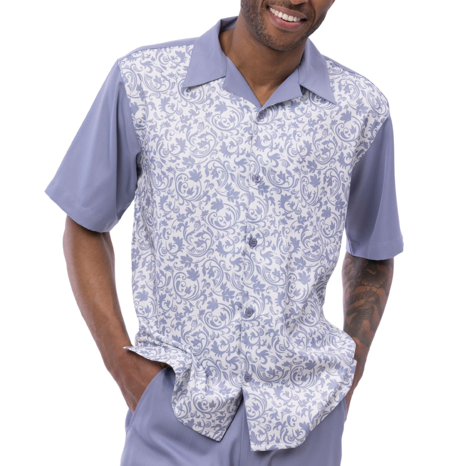 The Montique Equatorial Collection offers effortless sophistication with this Gunmetal walking suit. The short-sleeve button-down shirt showcases a delicate floral jacquard design on the front, paired with solid Gunmetal sleeves and collar for a balanced and refined look. Completing the set are matching Gunmetal pants that create a cohesive outfit. The adjustable waistband ensures maximum comfort, making this an ideal choice for casual outings or special occasions.