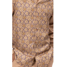 Introduce unparalleled sophistication to your wardrobe with the Eros Collection's Camel Print Design Long Sleeve Walking Suit. The long-sleeve shirt is adorned with a captivating gold pattern against a rich Camel backdrop, exuding opulence and style. Designed for versatility and comfort, the shirt transitions smoothly between casual and formal settings. The coordinating Camel trousers complement the shirt with a refined, streamlined look, perfect for any evening event or special occasion.