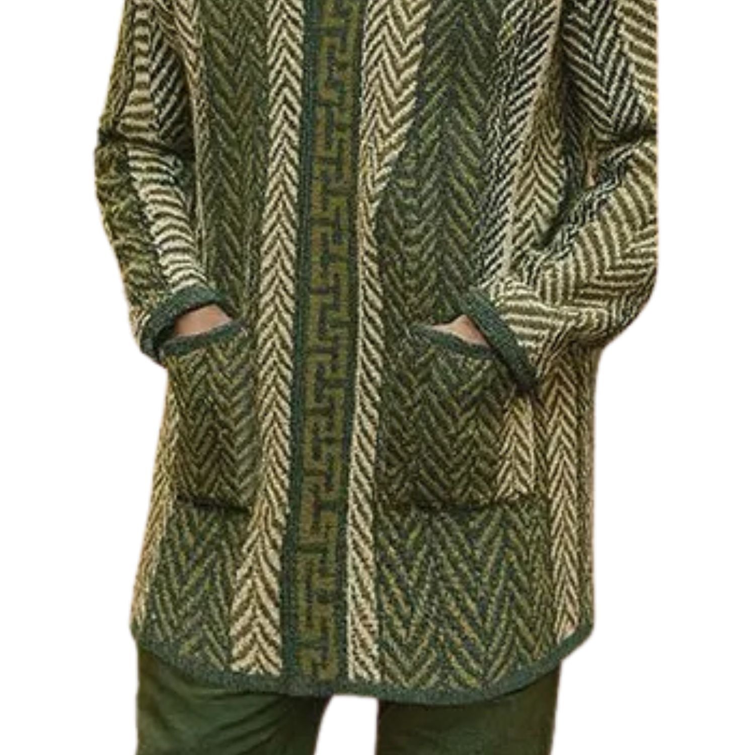A warm layer with standout texture, this 3/4 length hooded knit jacket blends colors and pattern with traditional knit detailing and a front Greek key motif. The wool blend material gives you a soft yet substantial feel that’s perfect for cool weather. Two front pockets and a relaxed fit add comfort and practicality.