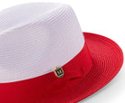 Galanza Collection: Montique Red Two-tone Pinch Fedora With Matching Grosgrain Ribbon- Wide Brim H47