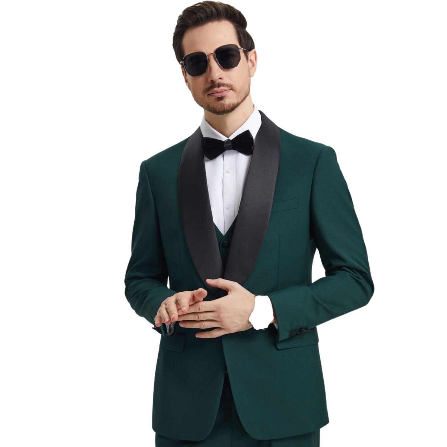 A statement in sophistication, the Ganymede Collection brings a sleek hybrid fit tuxedo with a satin shawl collar for a polished, formal look. Designed for elegance and comfort, this three-piece set includes a tailored jacket, vest, and pants, perfect for black-tie events and upscale occasions.