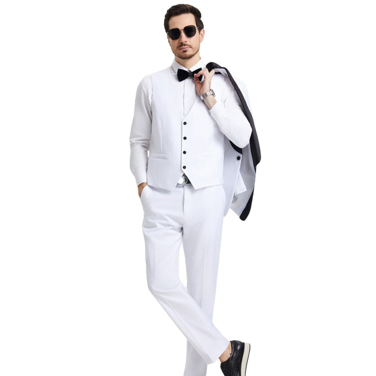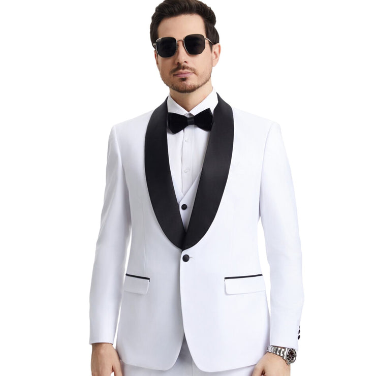 A statement in sophistication, the Ganymede Collection brings a sleek hybrid fit tuxedo with a satin shawl collar for a polished, formal look. Designed for elegance and comfort, this three-piece set includes a tailored jacket, vest, and pants, perfect for black-tie events and upscale occasions.