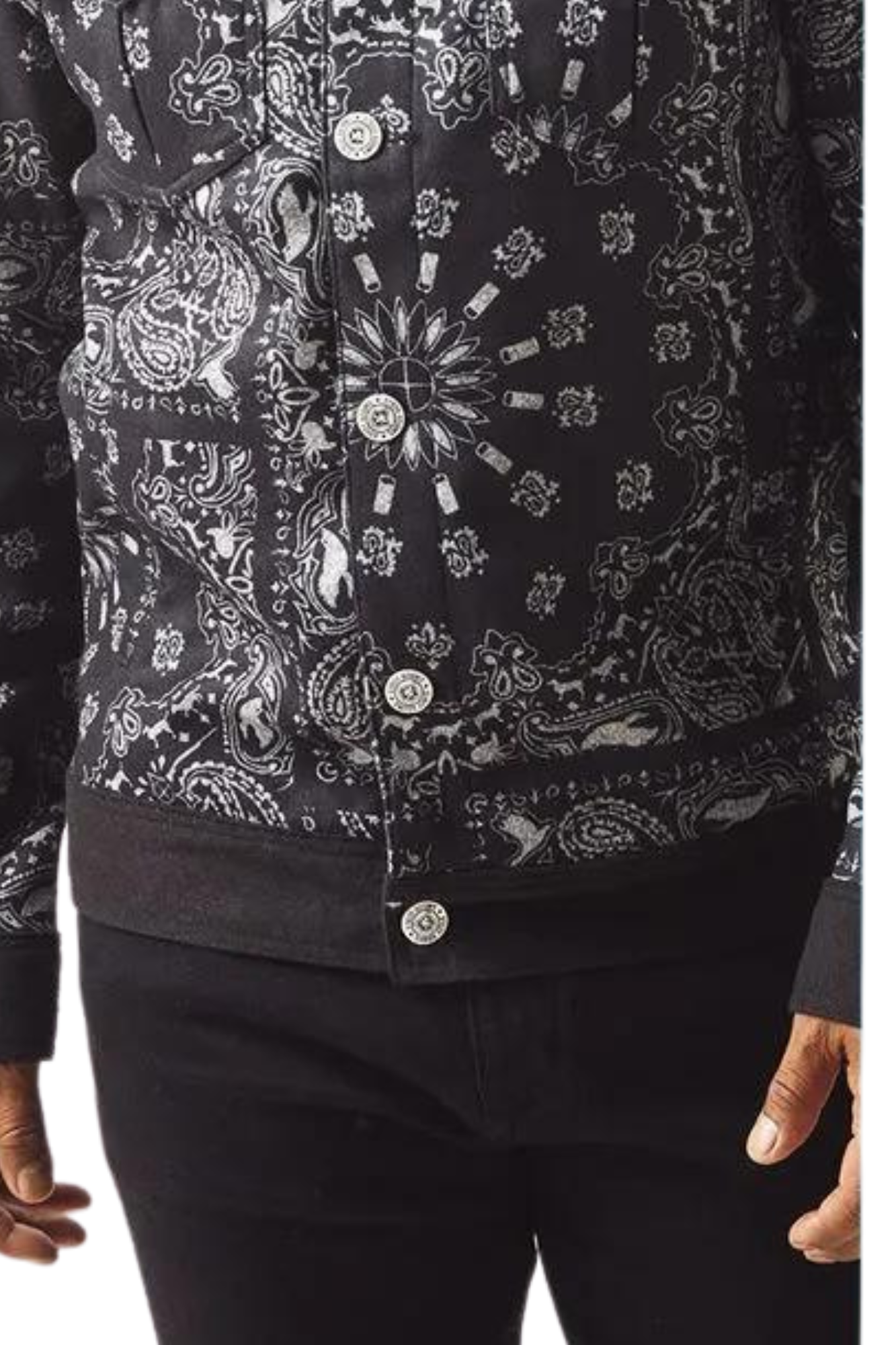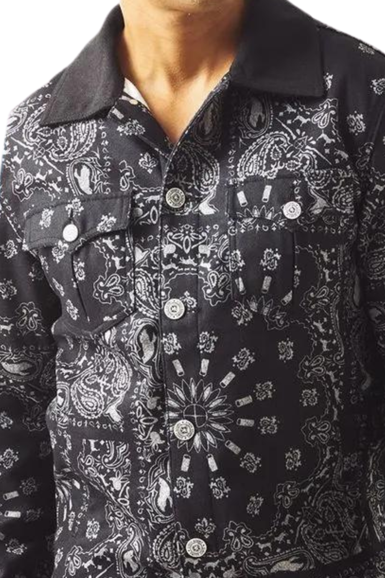 - Unique Paisley Print: The black jacket is adorned with a distinctive bandana-inspired pattern.