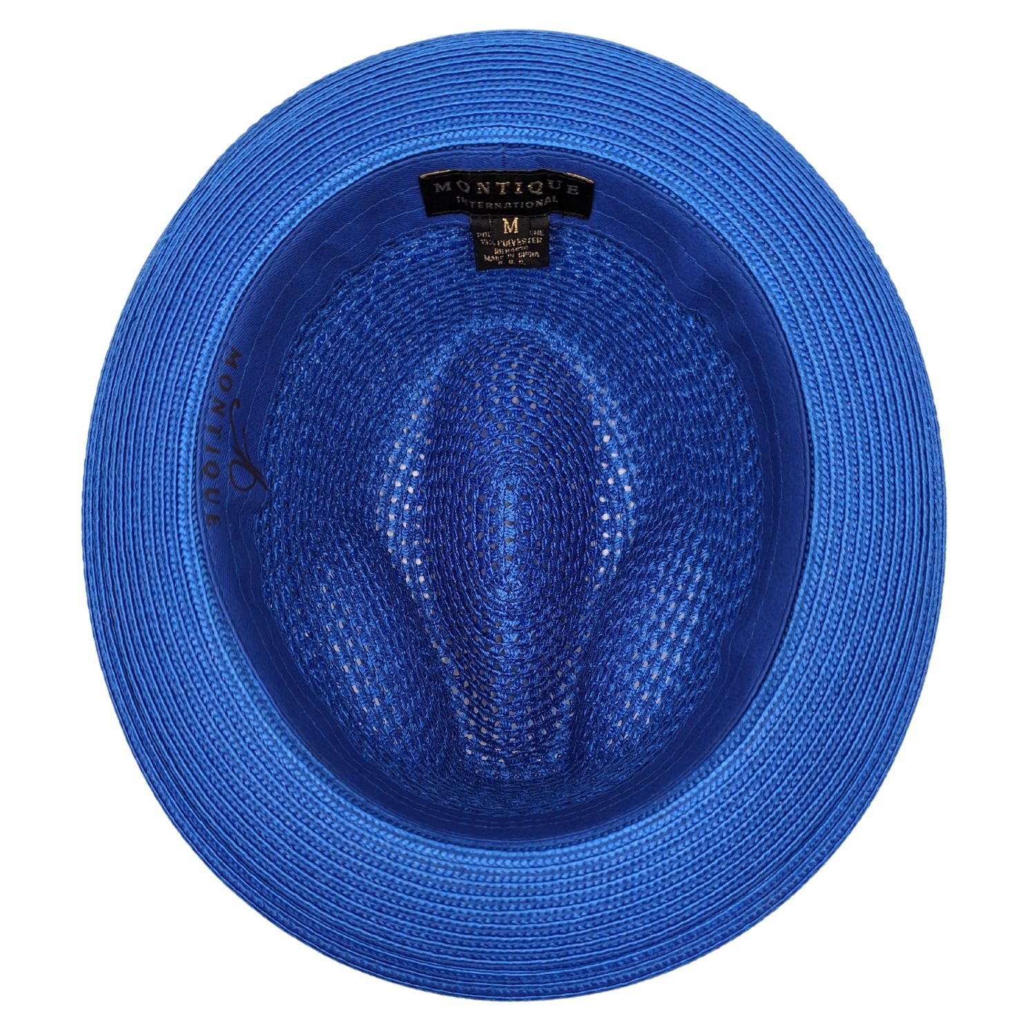 Be daring and fearless this summer in the Montique's Cobalt Solid Color Pinch Braided Fedora with matching satin ribbon. Perfectly airy for hot summer days, this stylish fedora is outfitted with a feather accent and Montique Pin. Show off your daring personality and challenge the heat in style with the Polyester Blend material and 2" brim size.