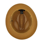 Be daring and fearless this summer in the Montique's Gold Solid Color Pinch Braided Fedora with matching satin ribbon. Perfectly airy for hot summer days, this stylish fedora is outfitted with a feather accent and Montique Pin. Show off your daring personality and challenge the heat in style with the Polyester Blend material and 2" brim size.